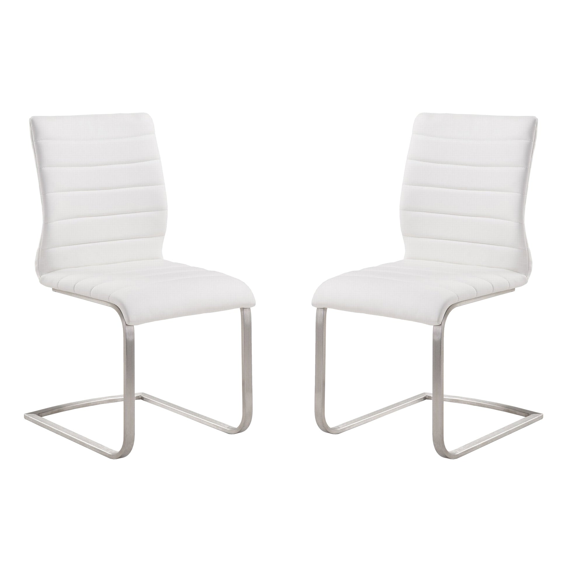 The Armen Living Fusion contemporary Set of 2 dining chairs are sure to be a standout in any modern household. The exquisite combination of brushed stainless steel and plush faux leather upholstery makes this chair both comfortable and dependable. The cantilever base with curved legs add a unique spin on the traditional dining chair design while the back and seat add an unmatched degree of luxury. The Fusion dining chair can be paired with the complementary Fusion dining table. This piece provides both versatile style and comfort with a Contemporary and Modern design that can easily be integrated into your home's current décor. The horizontal stitch padded seat with high density foam will provide you with all day comfort. The padded high back is ideal for posture alignment and an unmatched support for days on end. The foundation of the product is supported by stainless steel for a chic and stylish aesthetic without comprising practicality and functionality of this item. This product ships in one box with easy and quick set up. We stand by the quality, the craftsmanship and the integrity of our product by offer 1-year warranty for all our products. We want our customers enjoy our product and we will always be there to help with our top-notch customer service support. Excellent choice for a Modern, Contemporary and traditional Dining, living room or Kitchen setting. The Fusion dining chairs are available in white and gray leatherette/faux leather. Product Dimensions: 18"W x 22"D x 37"H