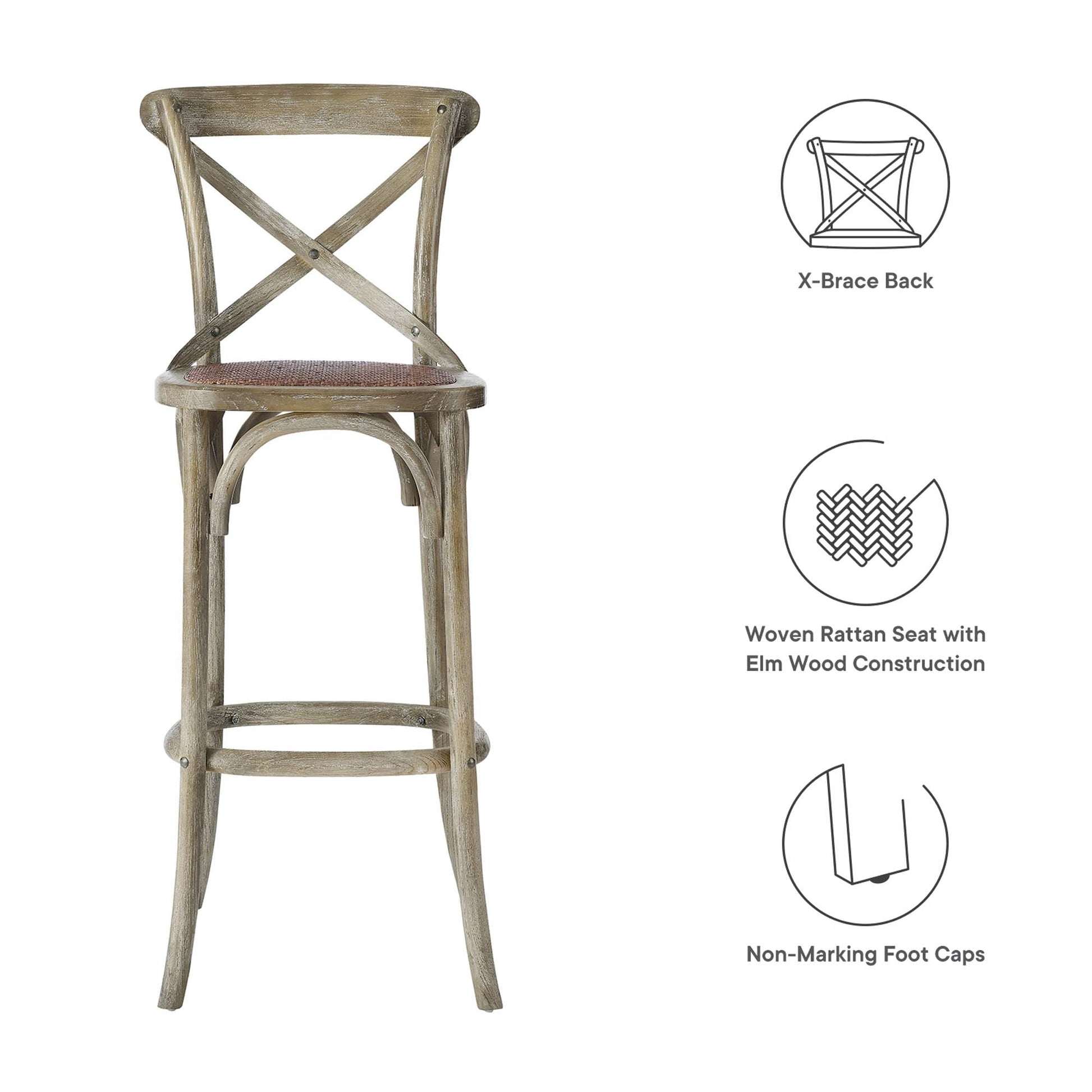 Introduce feelings of nostalgia as you gather around the kitchen counter for a quick breakfast or dinner with friends with the Gear Bar Stool. Blending farmhouse charm with modern style, this bar-height stool features an X-brace back and stretchers between splayed legs. With non-marking foot caps to protect flooring, this bar stool is crafted from durable elm wood for a sturdy construction that is built to last. Make a statement in your dining space or kitchen area with this versatile wood bar stool that features a woven rattan seat for added interest. Comes fully assembled. Weight Capacity: 330 lbs. Overall Product Dimensions: 19"L x 17.5"W x 43.5"H