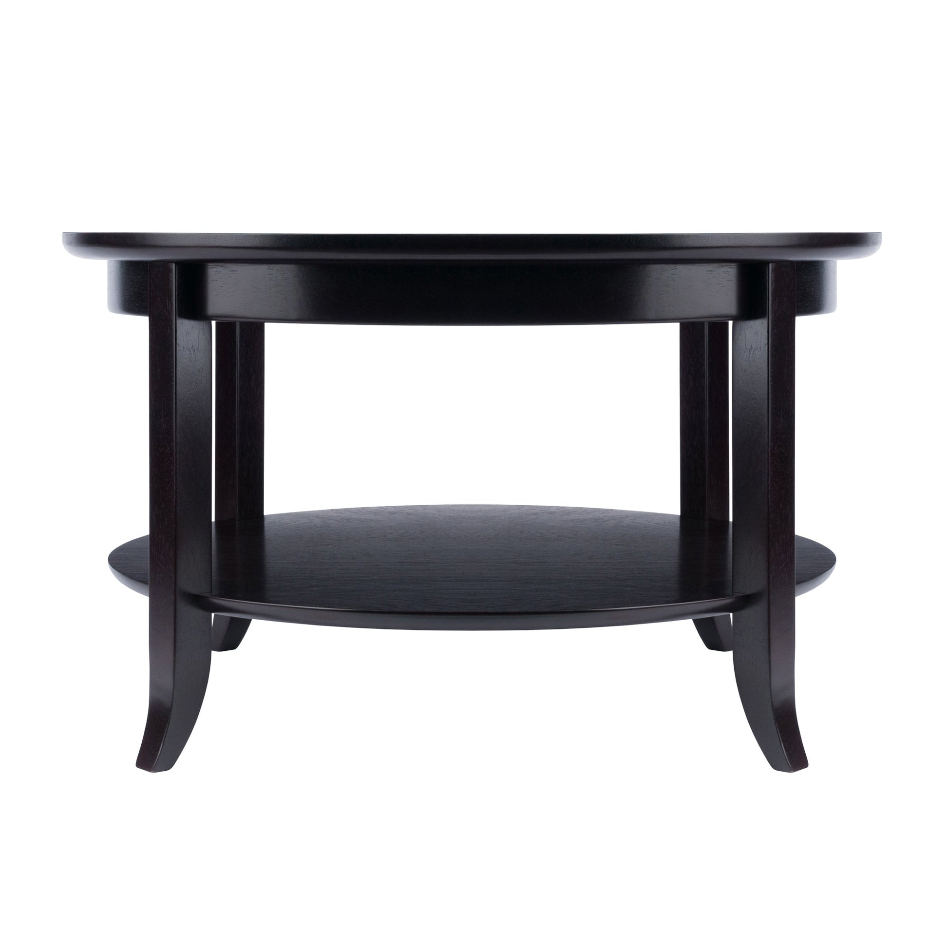 Enhance the decor of your room with the Winsome Wood Genoa Round Coffee Table. A sleek, modern design that will easily blend with existing decor or gives a traditionally styled room an instant makeover. This round coffee table features an inlaid tempered glass top, a spacious shelf for books or magazines, and lightly flared legs that add a final decorative touch. Perfect center table to lounge around in either the living room or family room. Finished in a rich espresso and constructed of solid and composite wood for long-lasting durability. Complete your space with the additional items from the Winsome Genoa collection (each sold separately). Conveniently packed and shipped in 1 box, that includes the hardware necessary for assembling. Replacement part request can be submitted directly to the manufacturer within 60 days from date of purchase.