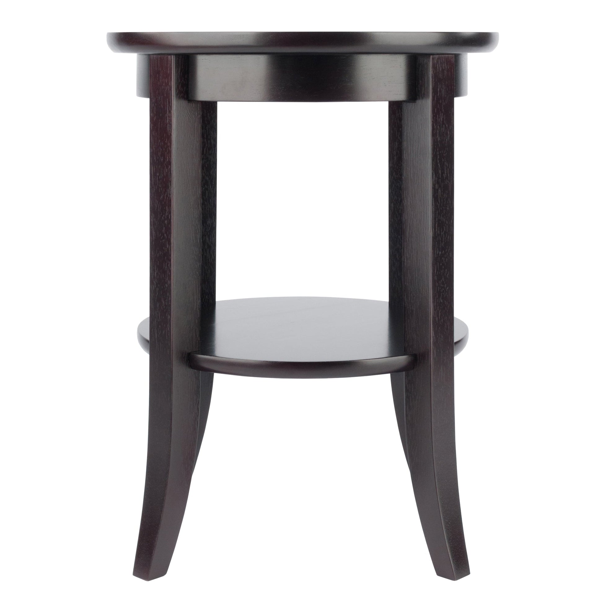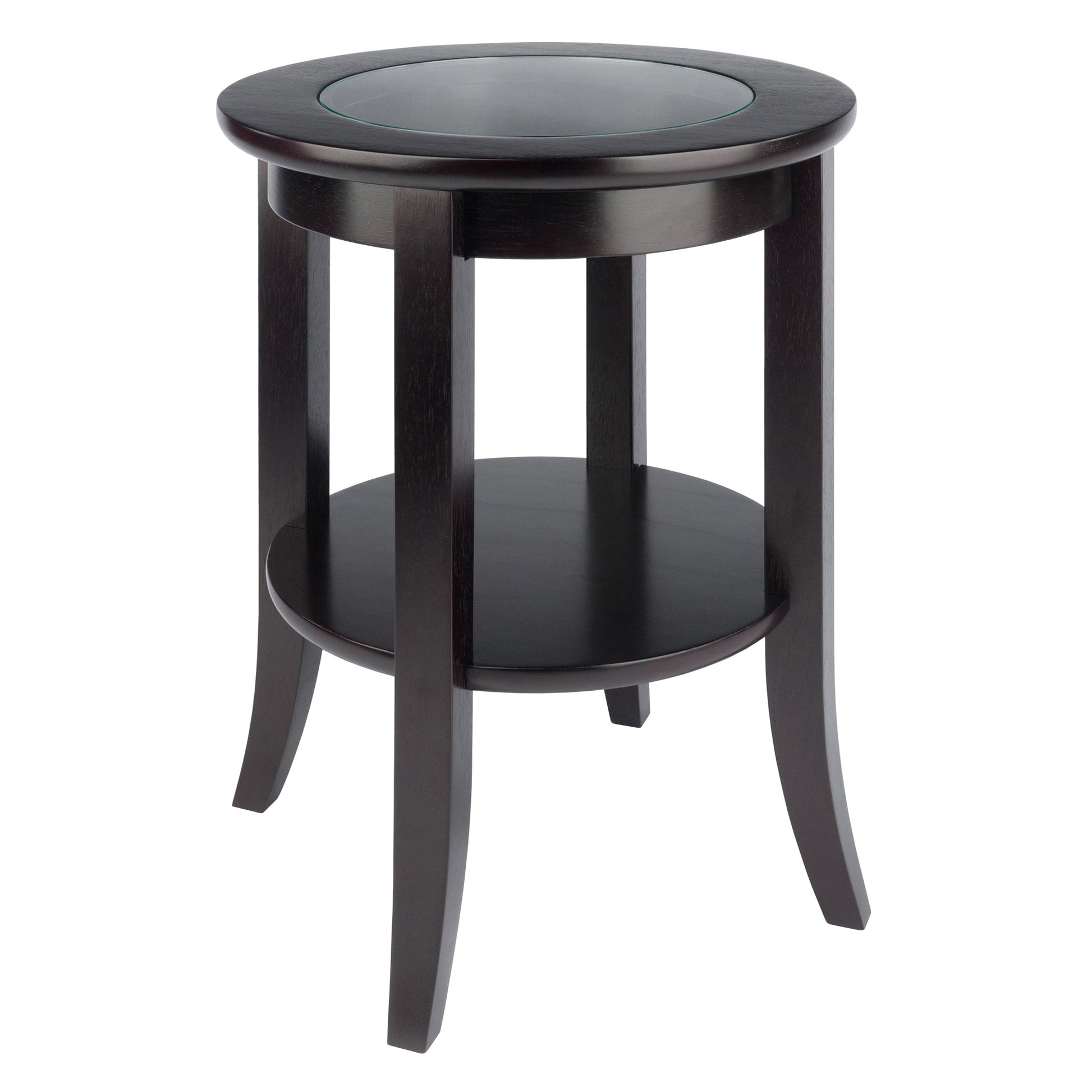Enhance the decor of your room with the Winsome Wood Genoa Round End Table. A sleek, modern design that will easily blend with existing decor or gives a traditionally styled room an instant makeover. This round end table features an inlaid tempered glass top, a shelf for displaying and lightly flared legs that add a final decorative touch. Perfect accent table to add to your living room or family room. Finished in a rich espresso and constructed of solid and composite wood for long-lasting durability. Complete your space with the additional items from the Winsome Genoa collection (each sold separately). Conveniently packed and shipped in 1 box, that includes the hardware necessary for assembling. Replacement part request can be submitted directly to the manufacturer within 60 days from date of purchase.Dimensions : 18.47 in. Wide 18.47 in. Deep 22.56 in. High