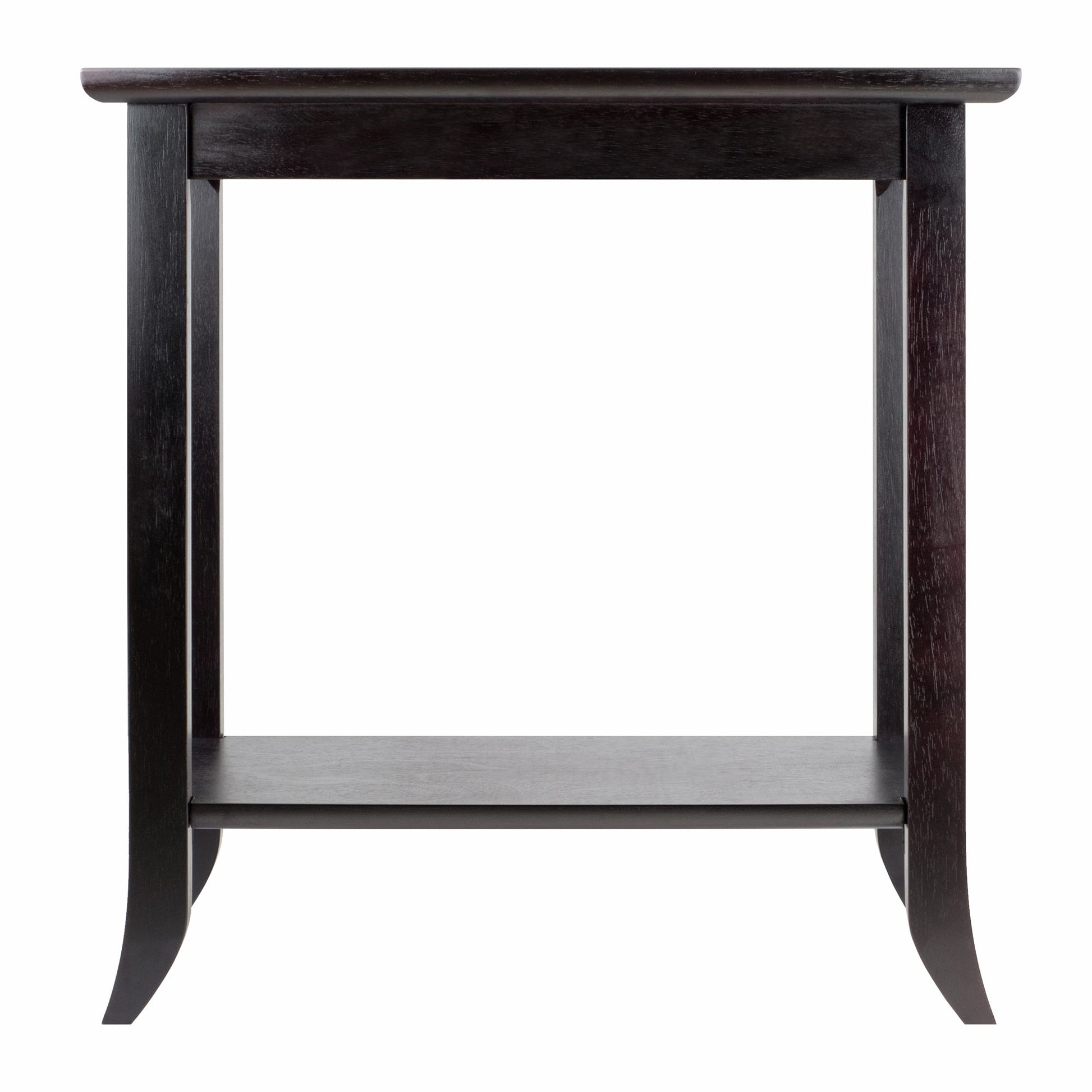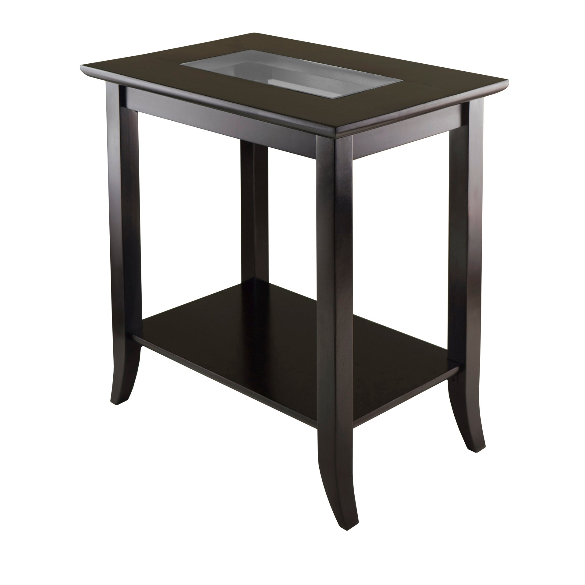 Style and versatility stand out in the Genoa Rectangular End Table by Winsome. Flaring at the tips of the legs and a tempered glass inset give this side table a distinctive edge while the rectangular shape provides an opportunity to position the table in two different ways. A lower shelf stores books, collectibles, or keeps your personal electronic devices there when you need them. The rich espresso finish will look right at home in any setting, from transitional to contemporary. Made from solid and composite wood with tempered glass. Conveniently packed and shipped in 1 box that includes the hardware needed for assembly.Dimensions : 23.94 in. Wide 16.3 in. Deep 25.04 in. High