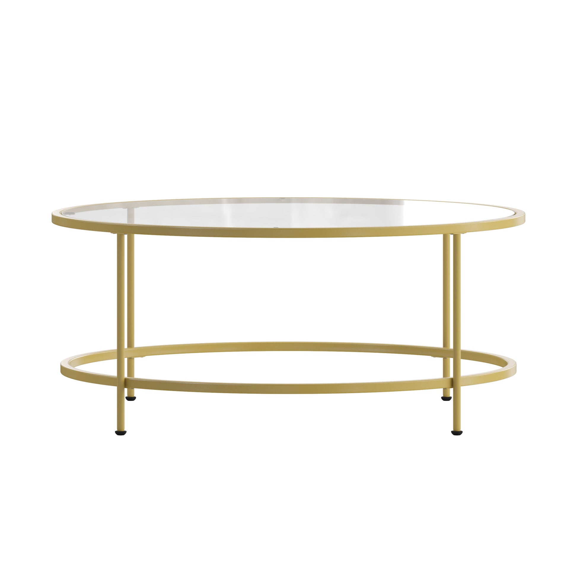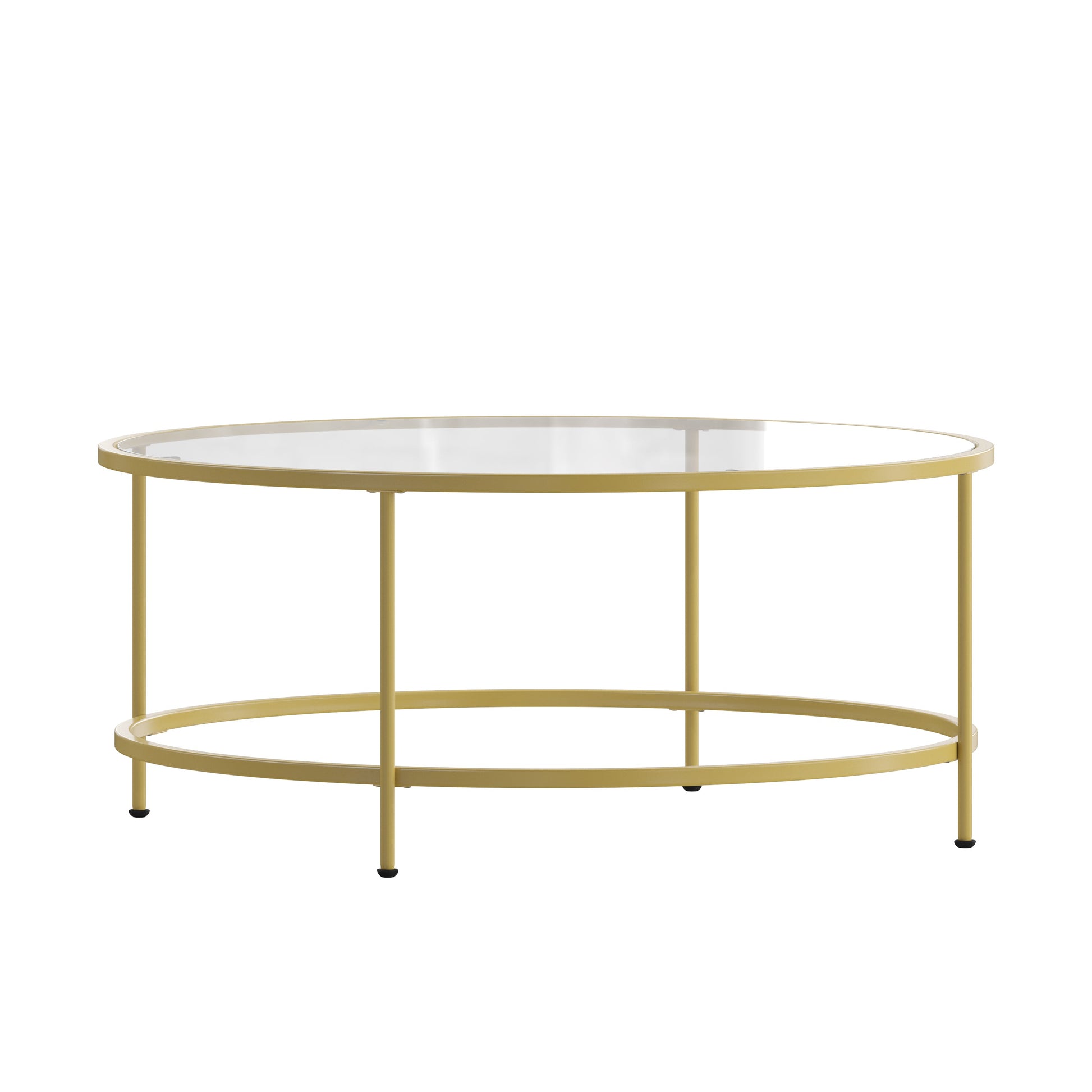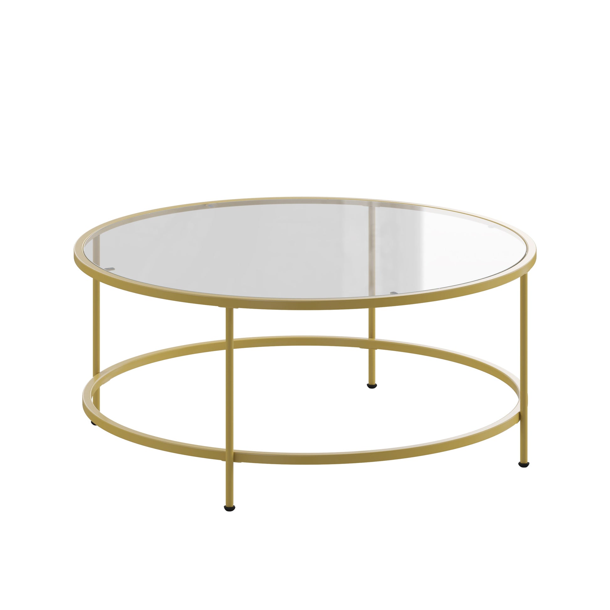 Astoria Collection Round Coffee Table - Modern Clear Glass Coffee Table with Brushed Gold Frame Dimensions: 35.25"W x 35.25"D x 15.25"H