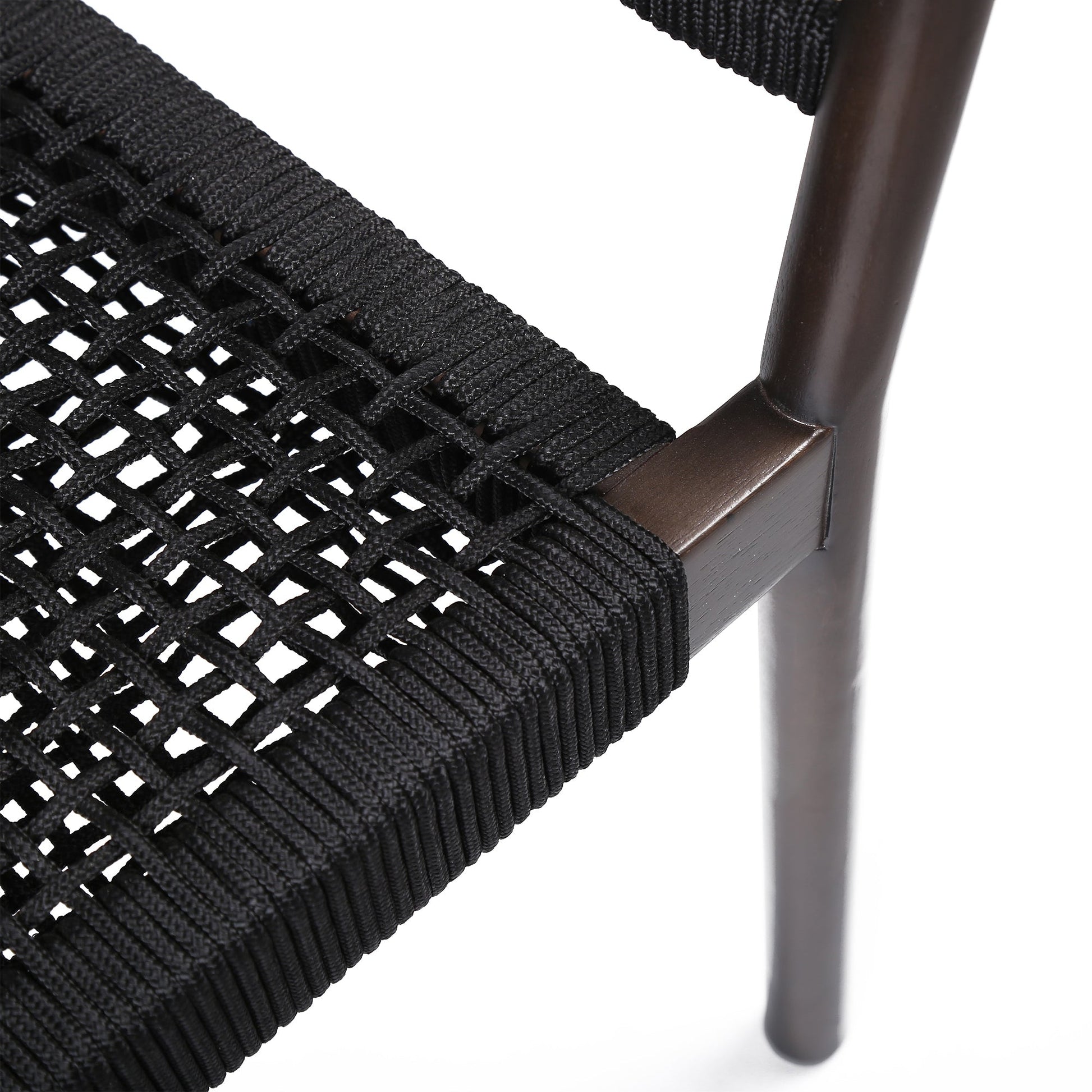 Transform your outdoor living area with the Doris Dark Eucalyptus and Black Rope Stackable Dining Chair Set from Armen Living. This pair of chairs introduces a refined charm and alluring aesthetic to your space. Wrapped in resilient regatta rope cording, these chairs provide supple support with element passthrough, enhancing your seating experience with a softness that rivals most fabrics. The open chair back ensures a breathable seating option, keeping you comfortable while seated. Crafted with a durable and highly weather-resistant eucalyptus wood frame, the Doris chairs offer longevity and years of extra enjoyment. Sold as a stackable pair, these chairs are perfect for mixing and matching to create your ideal outdoor atmosphere. Complementing these chairs is the Glendora Outdoor Patio Live Edge Dining Table – a stunning blend of natural beauty and contemporary design. Crafted with an Eucalyptus wood tabletop featuring a wavy live edge expertly sanded down for a unique surface, this table seamlessly merges organic allure with the industrial elegance of a black metal base. Designed for outdoor endurance, it boasts water-resistant and UV-resistant features, promising steadfast resilience through changing weather conditions. The durability of Eucalyptus wood ensures longevity, making the Glendora Dining Table an ideal choice for outdoor dining spaces. The captivating combination of the live edge and sleek metal base creates a striking focal point for your patio or outdoor dining area, elevating your outdoor aesthetic with organic elegance and modern design. Enrich your outdoor living space with the Doris Dining Chair Set and Glendora Dining Table – a combination of refined charm, alluring aesthetics, and enduring durability. Invest in quality outdoor furniture that seamlessly blends natural elements with contemporary design, creating a harmonious balance for your modern outdoor living.