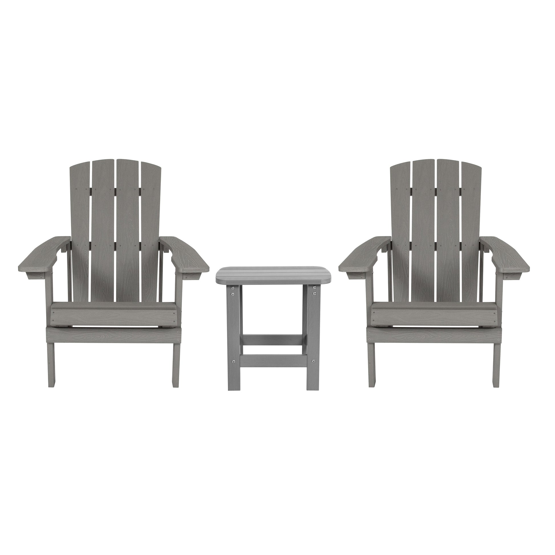 2 Pack Charlestown Commercial All-Weather Poly Resin Wood Adirondack Chairs with Side Table in Gray Dimensions: 29.5"W x 33.5"D x 35"H