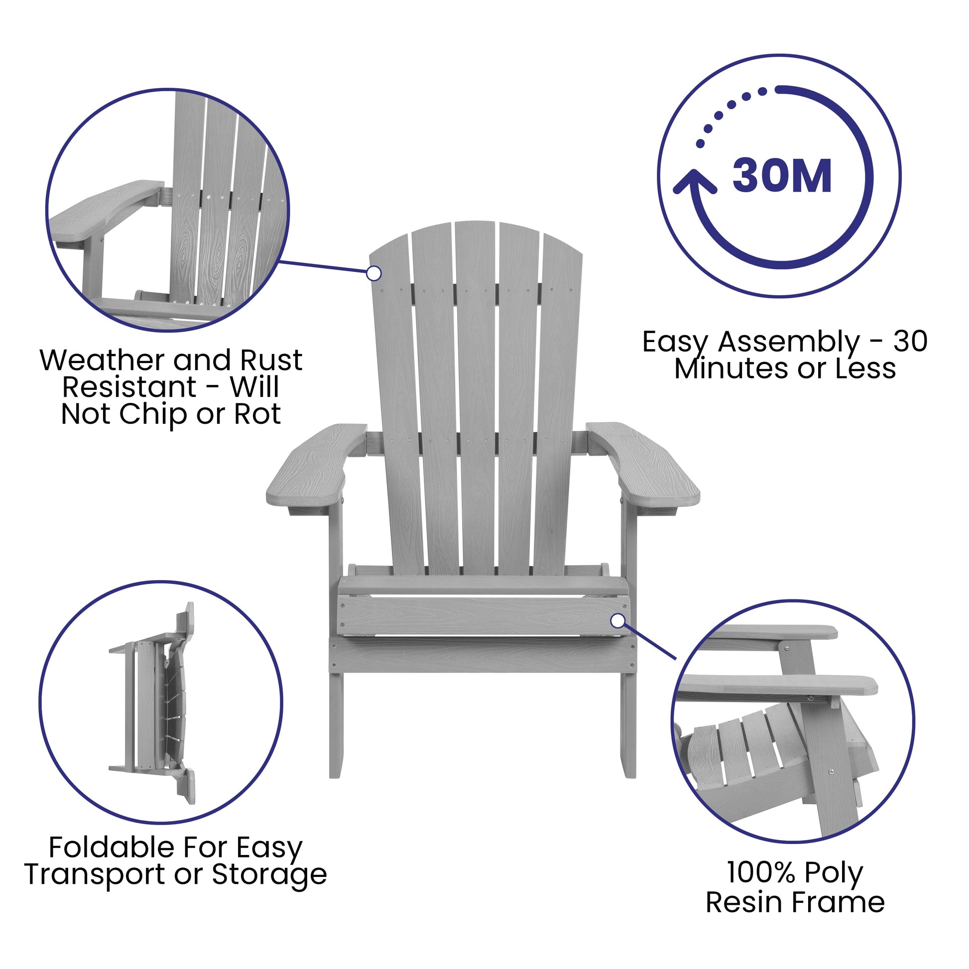2 Pack Charlestown Commercial All-Weather Poly Resin Folding Adirondack Chairs with Side Table in Gray Dimensions: 30.25"W x 34"D x 37"H