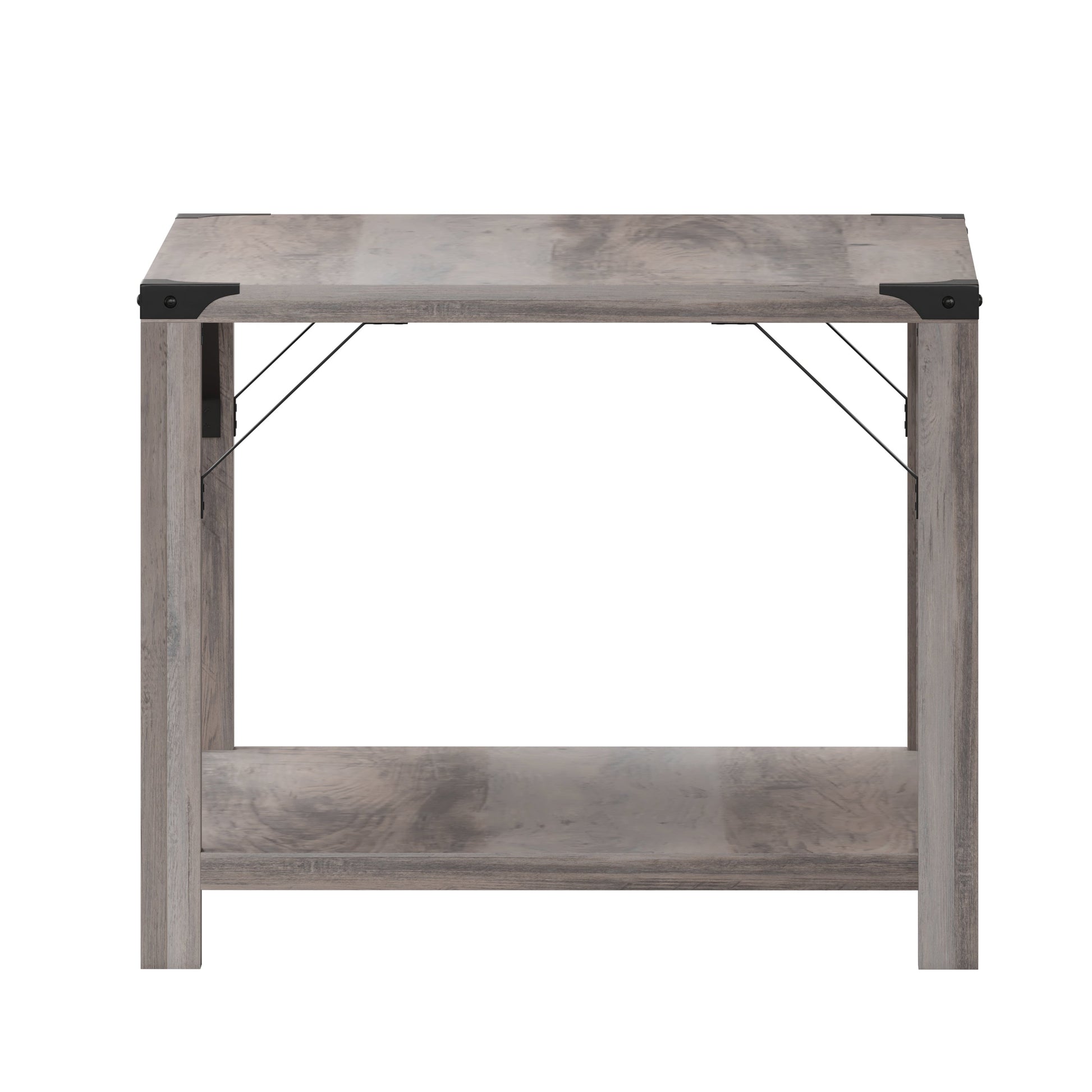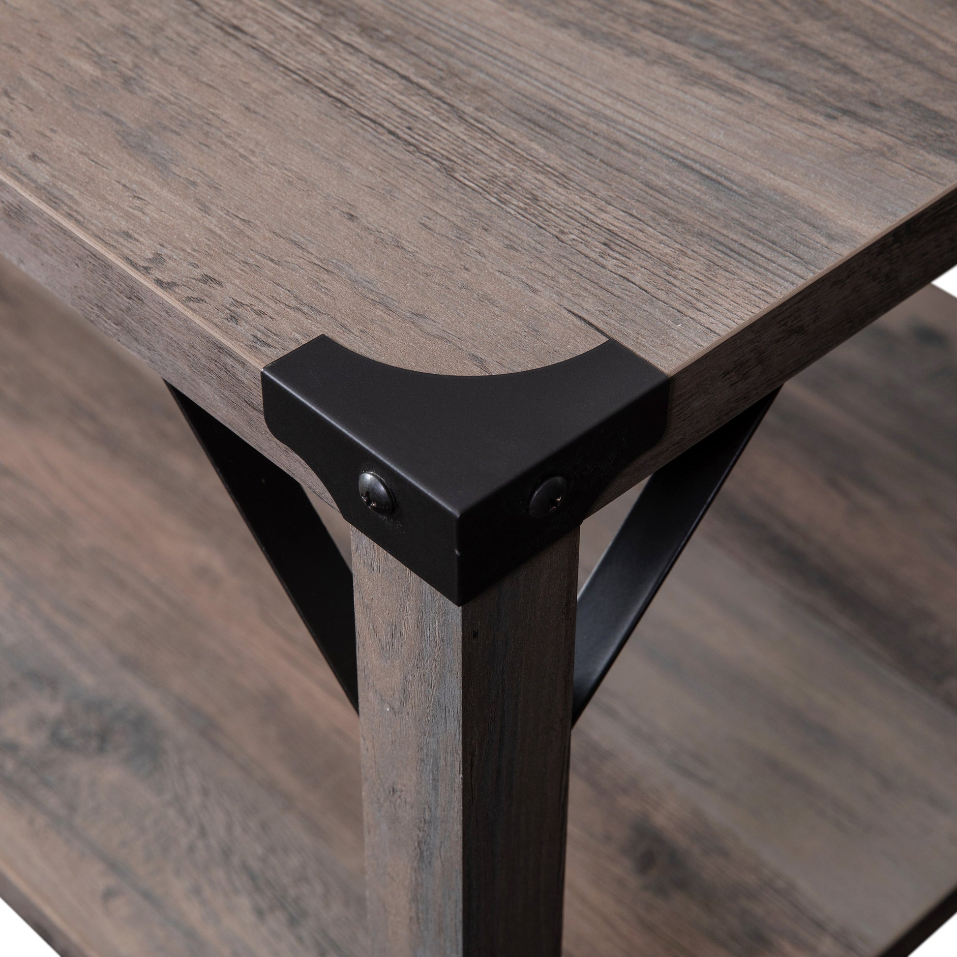 Wyatt Modern Farmhouse Wooden 2 Tier Coffee Table with Black Metal Corner Accents and Cross Bracing, Gray Wash Dimensions: 40"W x 22"D x 18"H