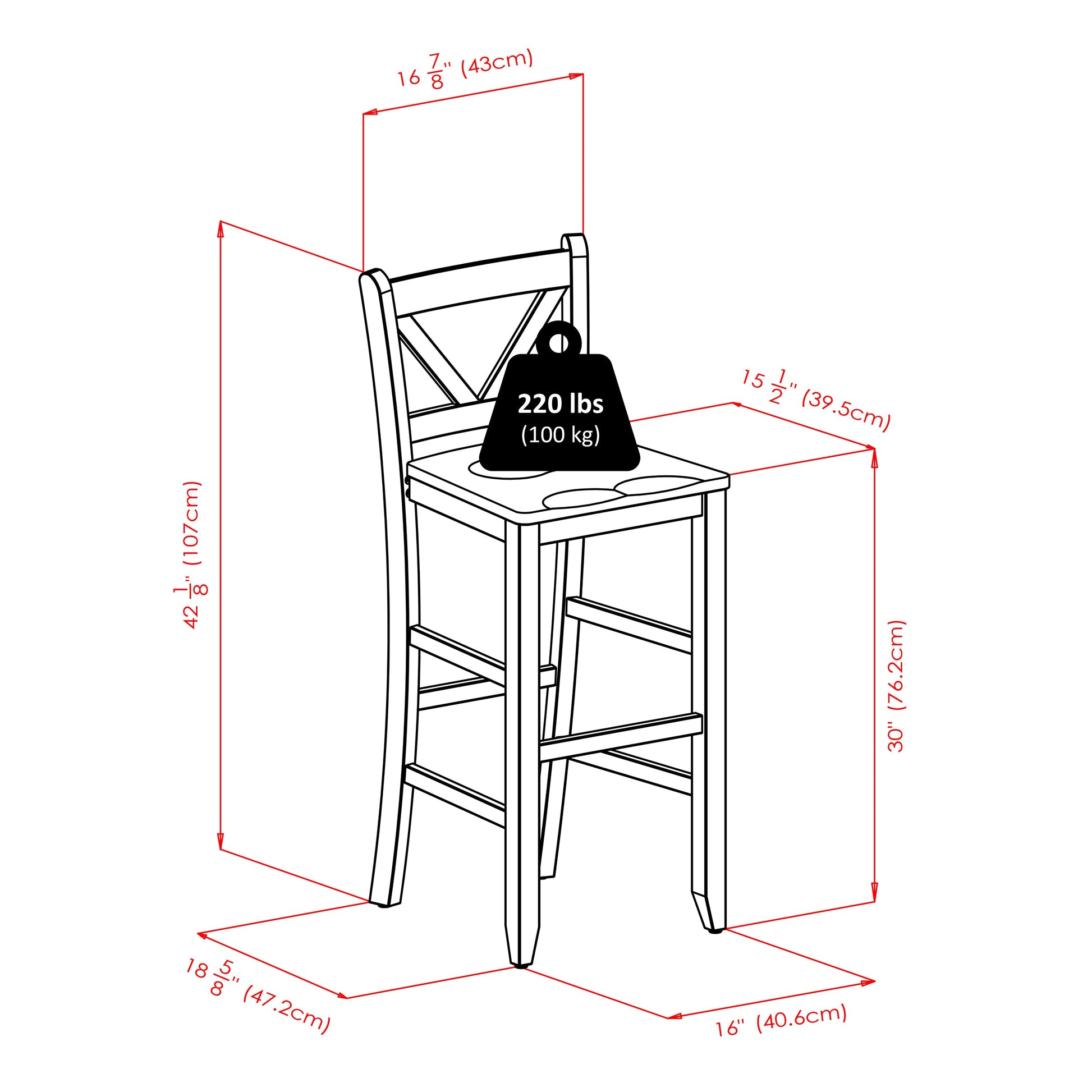 Entertain your guests around this sleek pub table accented with tempered glass providing a clear view to the shelf below. This unique configuration is functional as a display case or even storage for handbags and small accessories. Its long elegant legs lightly holds up the table with it's slight curved end. 2 V-Back Chairs complete the set with their elegant design and smooth curved legs. Top Dimensions is 25.6"W x 25.6"D. Shelf is 20.1"~22.5"W x 20.1"~22.5"D. Shelf clearance is 3.2"H. Distance between legs is 20.1" and the height from the bottom shelf to floor is 25.5". Chair seat dimension 16.6"W x 15.6"D. Back rest dimension 17"W x 12.2"D. Seat height is 30". Static weight capacity is 220lbs. The table is made of solid wood with the glass panel and comes in a walnut finish. Assembly required.Dimensions : 25.59 in. Wide 25.59 in. Deep 42.13 in. High