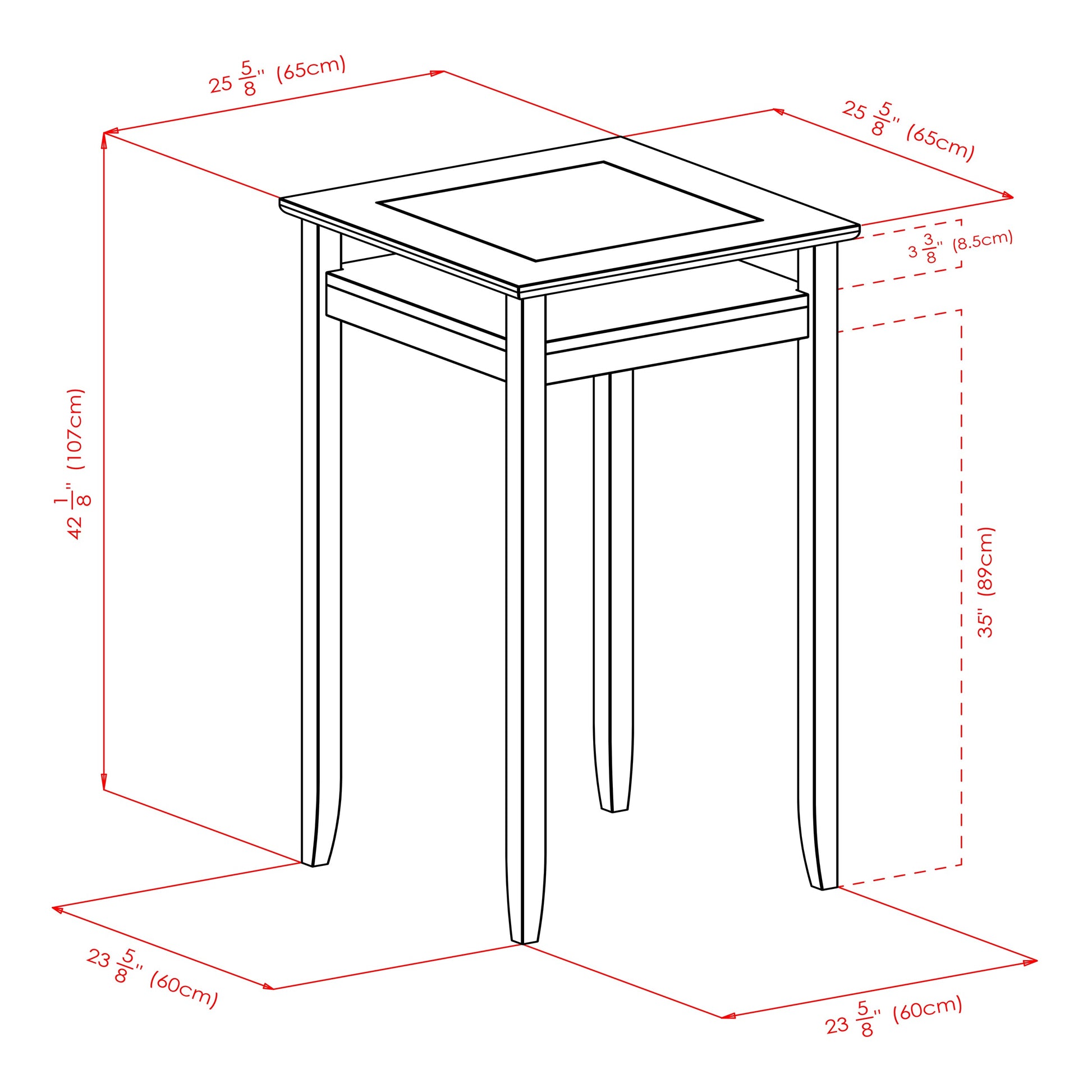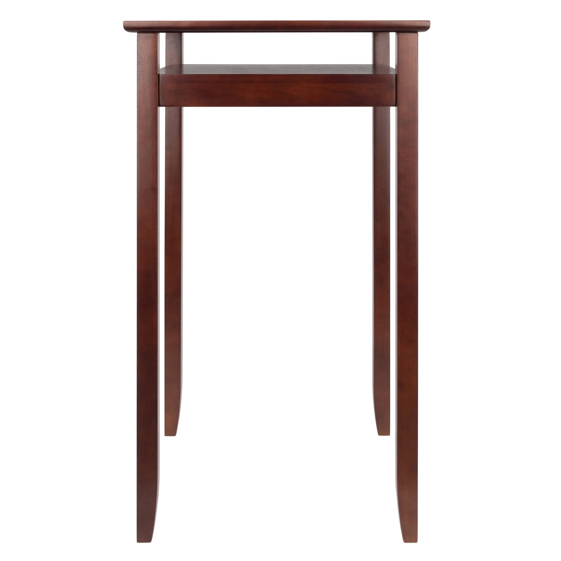 Entertain your guests around this sleek Winsome Wood High Pub Table. Ideal as a compact dining table, or pull up a counter stool and use it as a workspace. Offering exceptional versatility and making this an excellent space saving choice for a studio apartment or small spaces where a multipurpose table is ideal. Compact yet the long, tapered legs give this table a sophisticated style making it a great addition to any area. The accented tempered glass provides a clear view to the shelf below. This unique configuration is functional as a display case or even storage for small accessories. Generous height clearance from bottom of shelf to the ground at 25.50” H, that will go great with any style bar stools. Suitable for a variety of homes and functions, comfortably accommodating up to 4 guests. Create a dining surface in a kitchen or bar area, just add stools designed by Winsome Wood collection to complete a more unified space (each sold separately). Constructed of solid wood in a warm walnut finish and a tempered glass insert top. Conveniently packed and shipped in 1 box, that includes the hardware necessary for assembling. Replacement part request can be submitted directly to the manufacturer within 60 days from date of purchase.Dimensions : 25.59 in. Wide 25.59 in. Deep 42.13 in. High