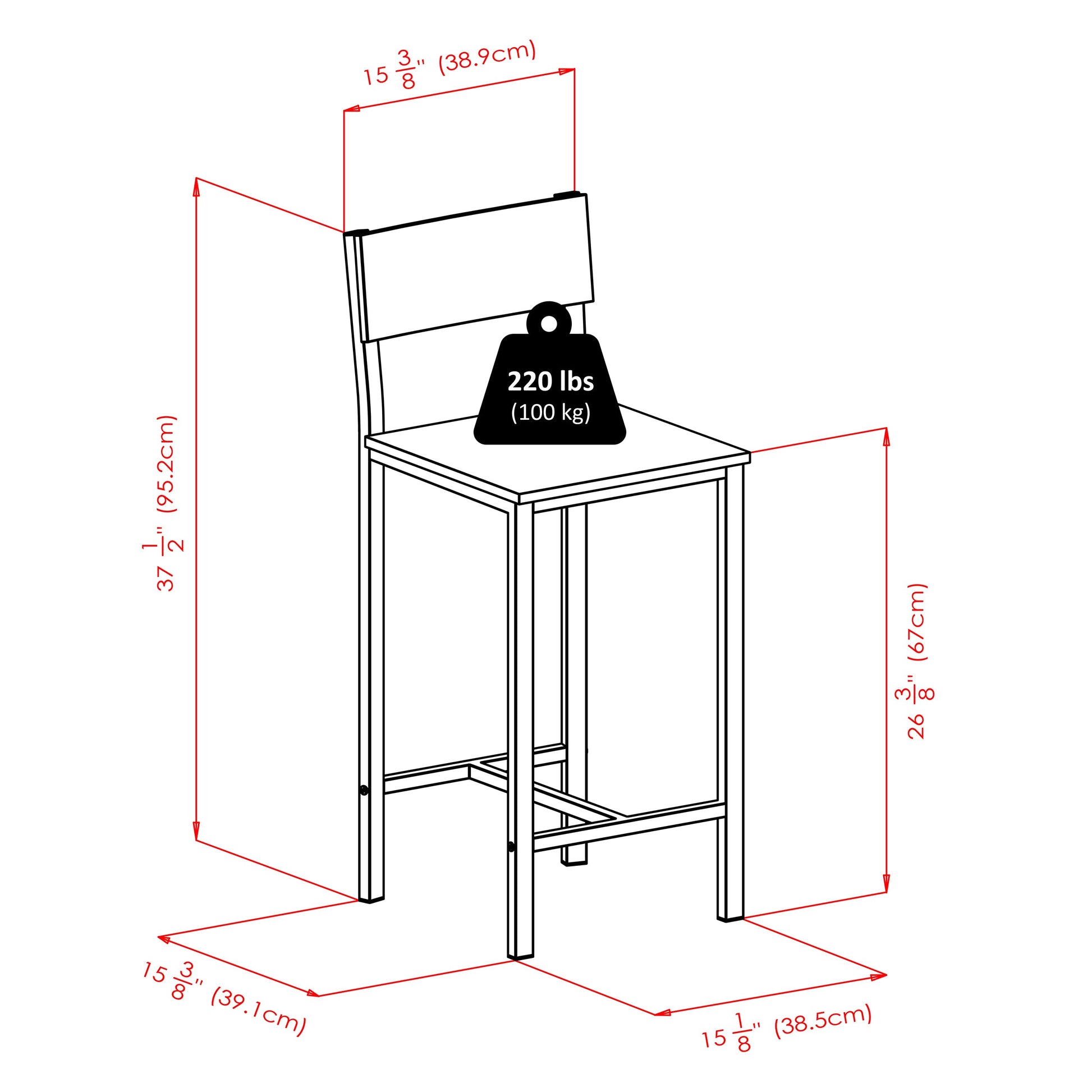 The Winsome Wood 3-pc Hanley Kitchen set is a simple yet functional addition to your living space. Offering exceptional versatility, with a compact size making this an excellent space saving choice for a studio apartment or small spaces where a multipurpose table is ideal. Wonderful for the kitchen, for dining or to use as a work table in your home office This set is perfect for entertaining friends, a game of cards, homework and more. Suitable for a variety of homes and functions, comfortably accommodating the two bar height stools included. Ample amount of space under the table, so you can tuck your stools away when not in use, saving your precious space. Stools have a seat height of 26.38” and have been tested to hold 220lbs each. Finished in black, the table top, stool backs and seats are constructed of MDF with metal frames for a modern look. For convenience this set ships in one box and includes hardware necessary for assembly. Replacement part request can be submitted directly to the manufacturer within 60 days from date of purchase.Dimensions : 42.01 in. Wide 23.62 in. Deep 38.03 in. High