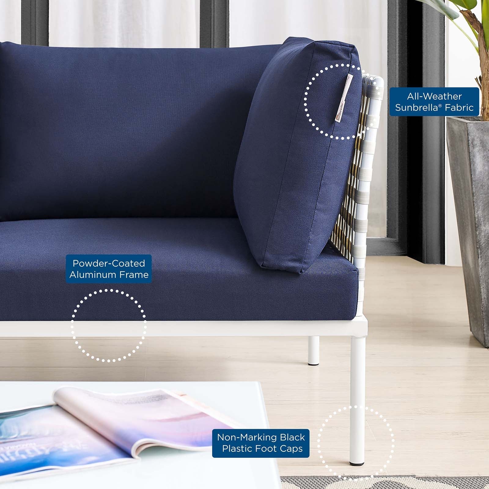 Engage life with Harmony. Enjoy casual conversation under the open sky with an all-weather waterproof furniture set that delivers an exceptional outdoor porch, patio, balcony or garden experience. An exceptional modern furniture set that exceeds expectations, Harmony comes with long-lasting machine washable Sunbrella® cushions, synthetic rattan seat back weave, square powder coated aluminum bases, tempered glass top tables, and non-marking foot caps. A sectional that arranges according to the spontaneous needs of your guests, set your sights on open and inspired moments with the Harmony Outdoor Patio Collection. Set Includes: 3 Corner Chairs, 2 Armless Chairs, 1 Coffee Table