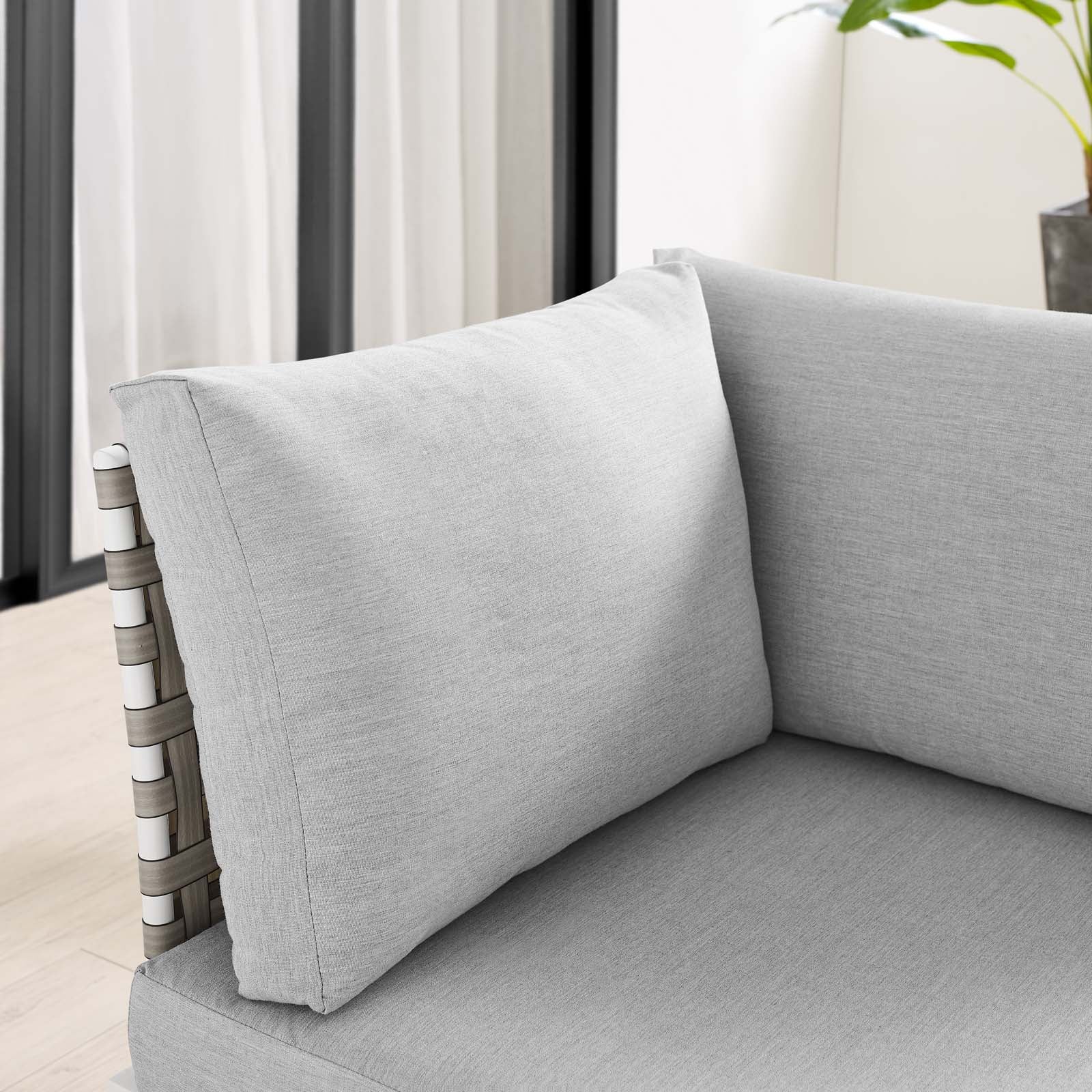 Engage life with Harmony Outdoor Patio Corner Chair. Enjoy casual conversation under the open sky with an all-weather waterproof outdoor sofa chair from a versatile furniture set that delivers an exceptional outdoor porch, patio, balcony or garden experience. An exceptional modern outdoor furniture set that exceeds expectations, Harmony Patio Corner Chair comes with synthetic rattan seat back weave, square powder coated aluminum bases, Sunbrella® cushions, and non-marking foot caps. An outside sectional corner chair that arranges according to the spontaneous needs of your guests, set your sights on open and inspired moments with the Harmony Outdoor Patio Collection.