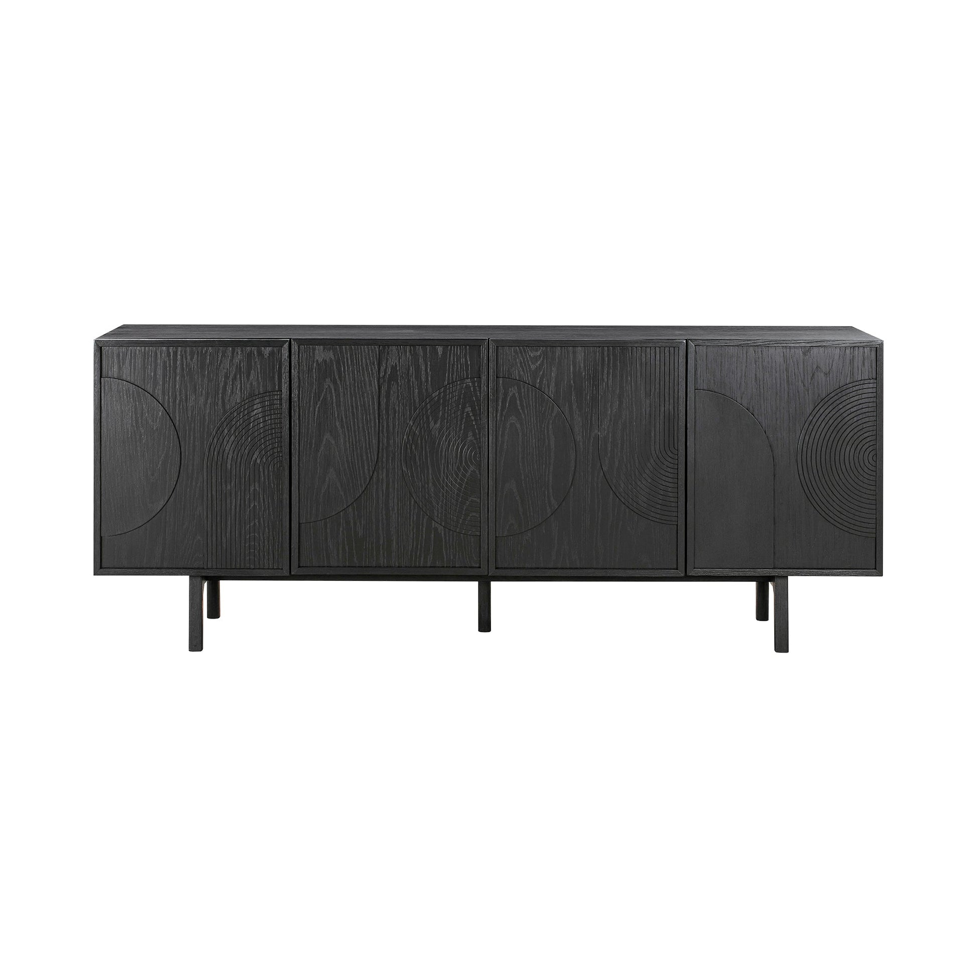 Give a stylish upgrade to your home with Holland 4 door sideboard buffet in black brushed oak. The stunning sideboard buffet cabinet uses geometric shapes to attain a rhythmic and visually captivating design. It juxtaposes textural lines across the plain surface to give an artisanal feel. A true showstopper, our sleek and modern buffet is elevated upon slender round legs. Showcasing rich grains of Oak, this server buffet console can add depth and dimension to your living room, dining room, entryway, bedroom, or home office. Oak is a highly durable hardwood used for thousands of years. It has a unique grain pattern derived from the rings of the oak tree. It contains high levels of tannins, allowing the wood to resist insects, mold, and fungus naturally. Use it as a buffet, bar, media unit, or office cabinet to keep all your storage organized behind its sculptural facade.