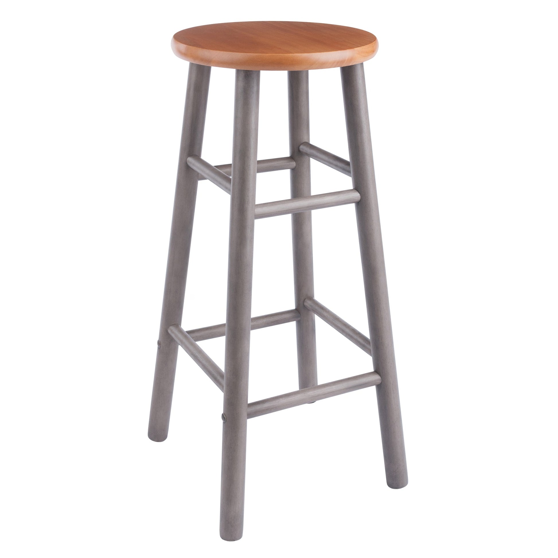 The Winsome 2-piece Huxton Bar Stools will be your go to seating in the den, family room or kitchen. They feature a more conservative foot print than many other flared-leg stools which give them a streamlined, contemporary look and allow them to be tucked neatly underneath a counter or high table. Crafted of Solid Wood, the charming combination of a Teak-finished seat and Gray base are a perfect fit with any decor from farmhouse to transitional to modern. Both high and low crossbars on all sides provide stability while also serving as convenient footrests. The round seat is more than 13" in diameter, providing a generous seating area or an attractive stand for your favorite lamp or plant. The stools are 29.3" high and hold a static weight of 220 lbs. They are also available in a counter height stool at 24"H. The 2-piece set is conveniently packed and shipped in one box that includes the hardware needed for assembly. Replacement part request can be submitted directly to the manufacturer within 60 days from date of purchase.
