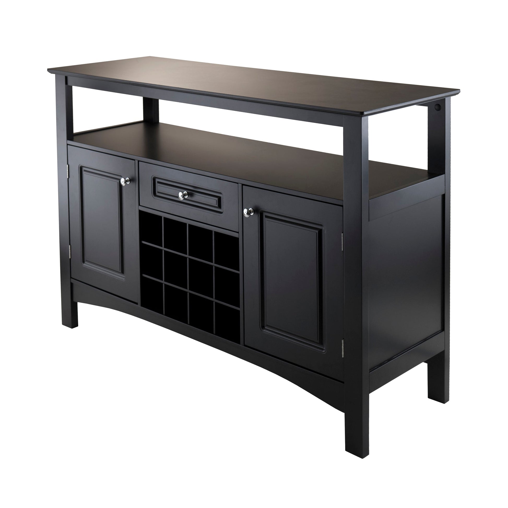 Versatility is the hallmark of the Winsome Wood Jasper Buffet Display Cabinet. This modern piece can be the highlight of your living room to store your wine, stemware and display collectibles. Or let it stand out in the dining room as a sideboard to showcase your best serve ware, while keeping a few favorite bottles of wine on hand. Store up to 12 bottles in the wine grid or use this space as storage as you have the option to remove the grid for an additional open shelf. A unit-wide open shelf is ideal for setting out glasses and plates, or for display purposes. Just below is a center drawer that provides ample space for silverware, wine opener and other accessories. Plenty storage inside the two doors, on each end, just over 16in. allowing storage height for bottles or decanters. Constructed of sturdy, durable composite wood in a solid, sleek black with nickel finished knobs. Conveniently packed and shipped in 1 box, that includes the hardware necessary for assembling. Replacement part request can be submitted directly to the manufacturer within 60 days from date of purchase