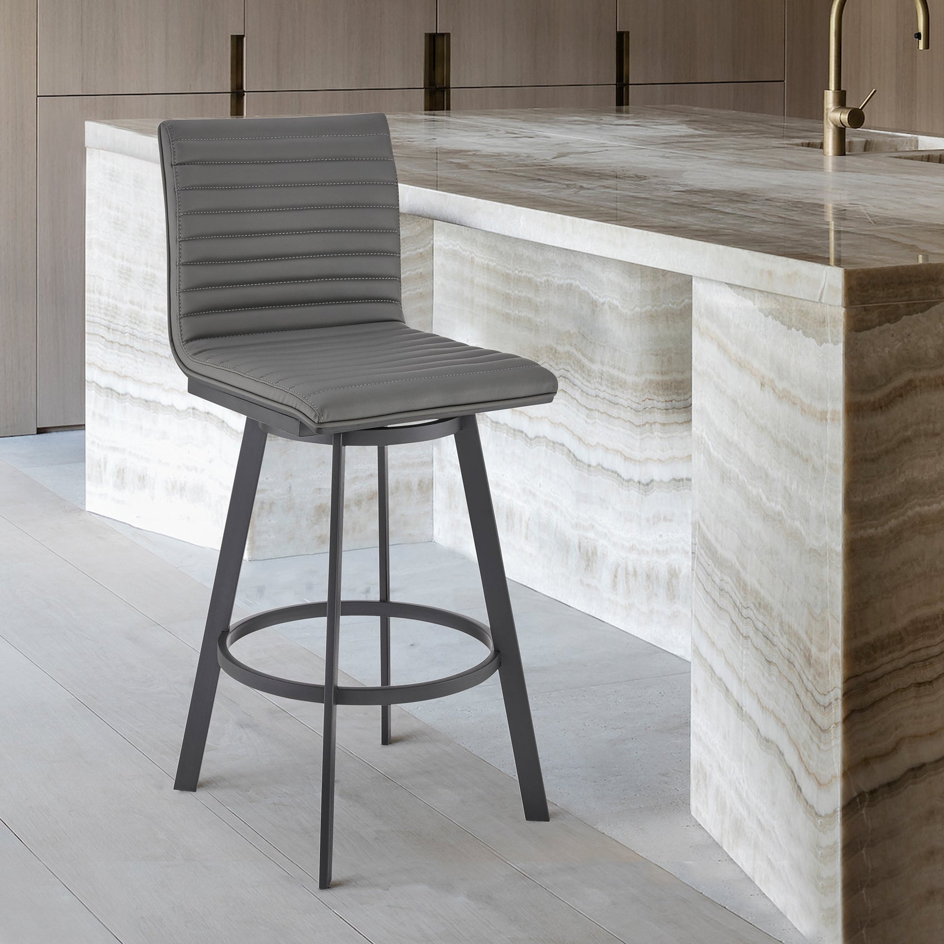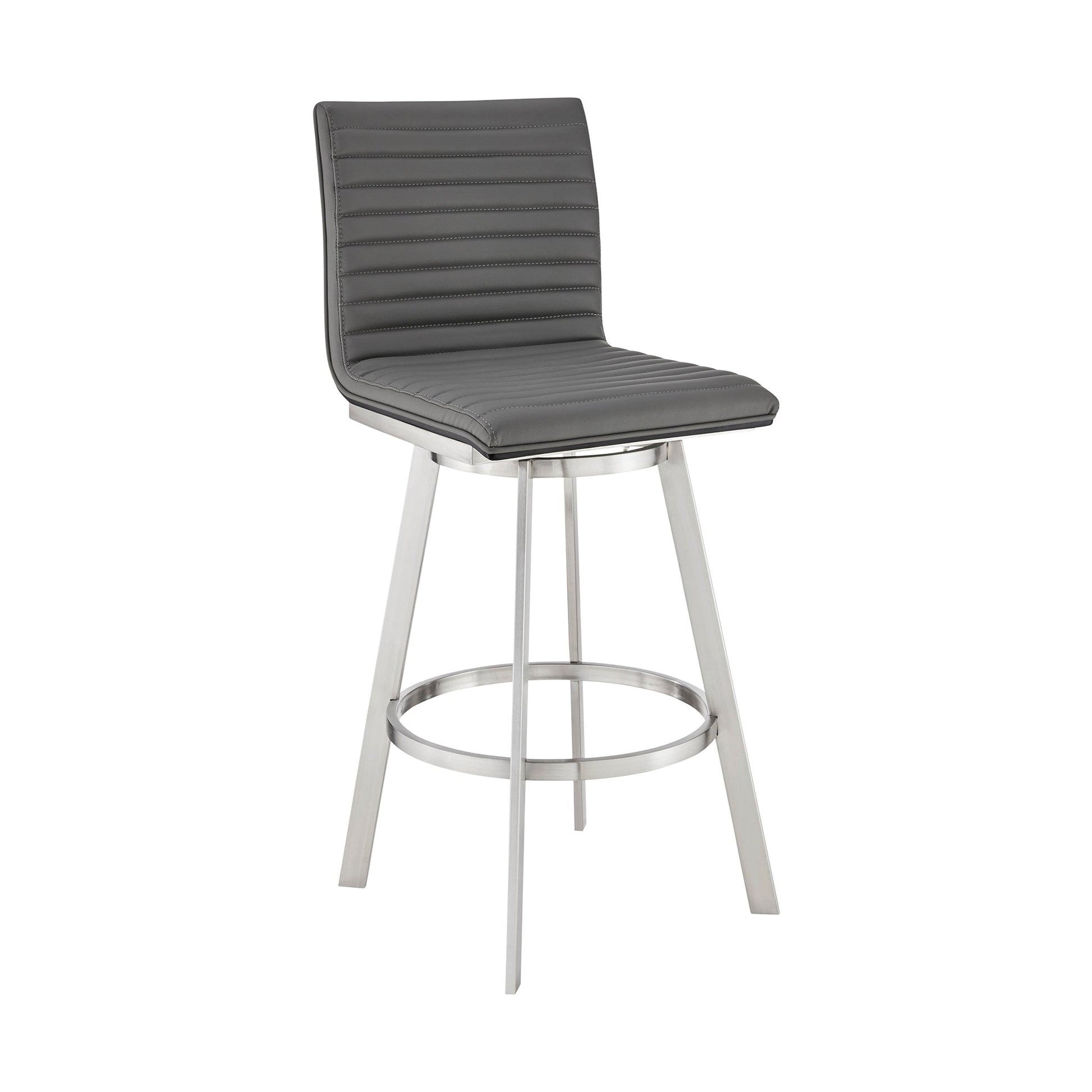 With its thoughtfully designed brushed wood veneer back and convenient metal footrest, this bar stool offers additional support and stability, allowing you to relax in style. Whether you prefer a refined brushed stainless steel finish or a modern matte black finish, this versatile stool complements a variety of interior aesthetics. The gray faux leather upholstery adds a touch of elegance, making it a statement piece in your kitchen, bar, or dining area.