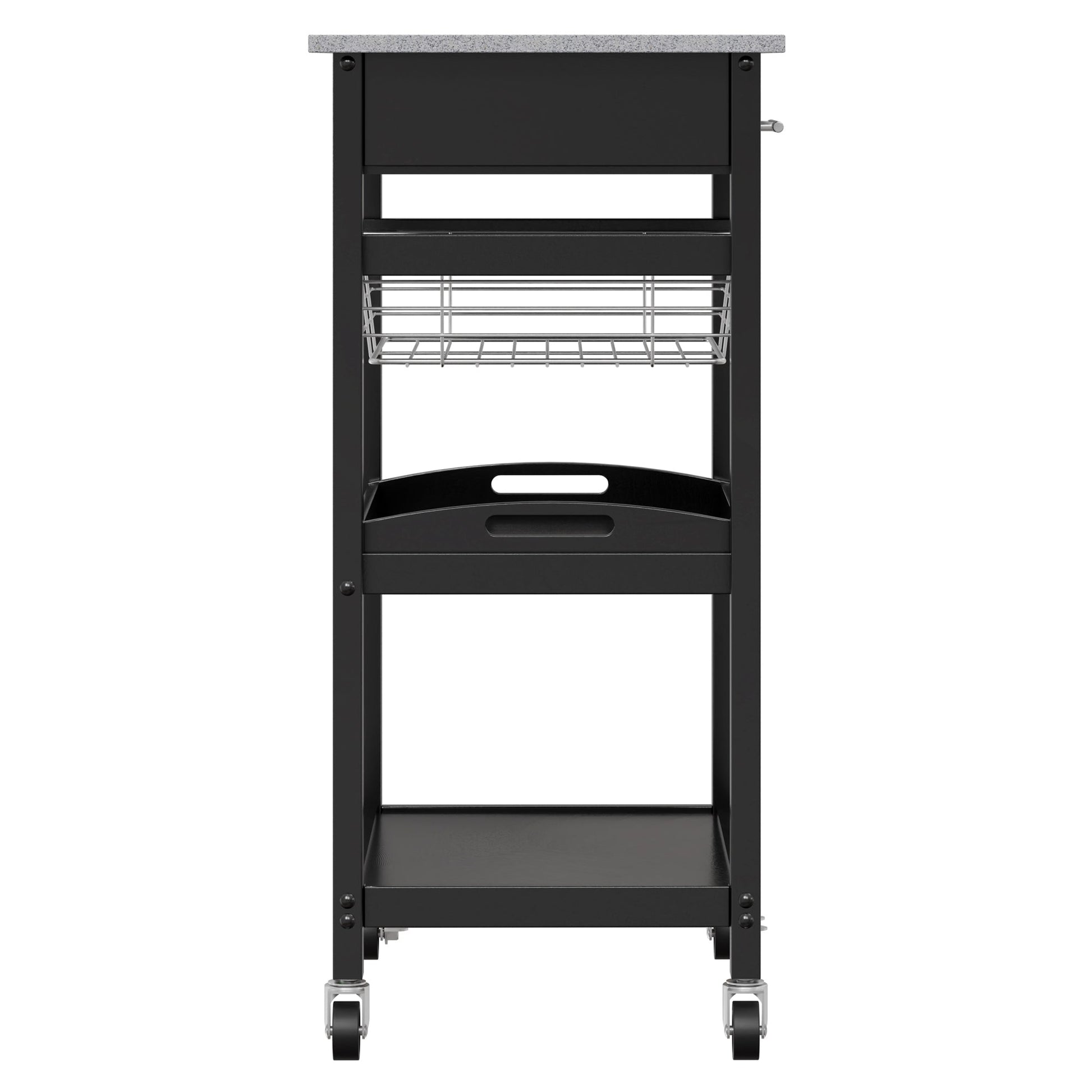 Give your kitchen a modern, functional touch with this Winsome Wood Julia Utility Cart. This remarkable cart provides many uses and its compact size makes this cart perfect for a small kitchen needing more storage or additional counter space for a small appliance. Featuring a granite top that provides easy-to-clean work station perfect for preparing drinks or lunch. The center serving tray is removable and has cut-out handles on each end, that is ideal for carrying for snacks out to the kids or guests. Store utensils or silverware in the drawer, and right below kitchen towels in the slide out metal basket for quick access. The bottom fixed shelf is great for bowls or additional storage. Easily roll out from kitchen to dining room, this cart sits on 4 casters, two which lock to keep stable while in use. Constructed of sturdy solid wood and composite finished in black that allows this cart to blend well with most home decor. Packed in one box, with hardware necessary for assembly.