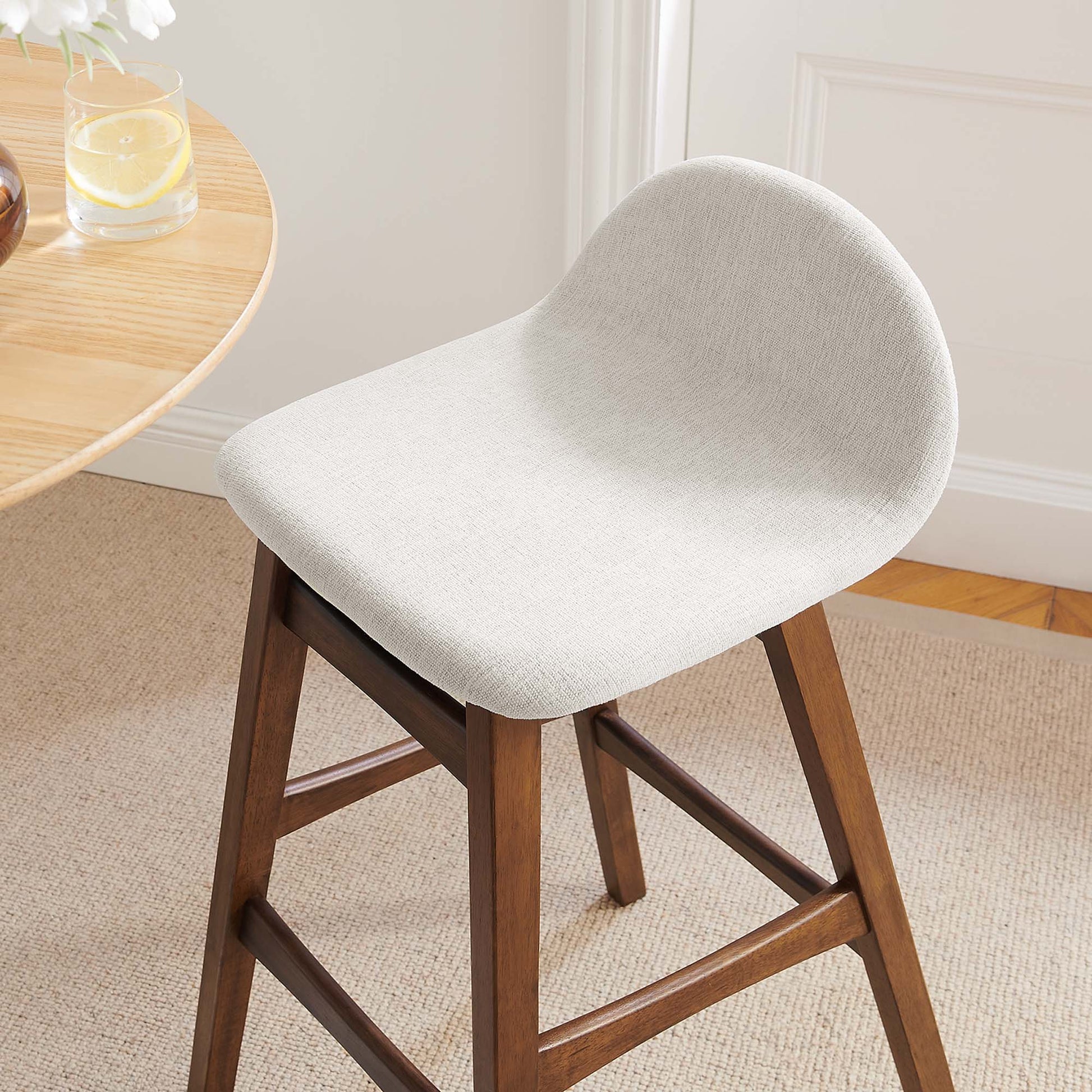 Invite lighthearted banter and deep conversations as you perch on the Juno Bar Stool Set of Two. This set of bar stools boasts splayed rubberwood legs and durable plywood seats, upholstered in woven heathered fabric. The unique arched contour of the low backrest, paired with integrated footrests and side supports, ensures optimal comfort for lasting sit-downs. With a mix of vintage-modern style and mid-century appeal, this pair of stools is multifaceted, serving as pub chairs, dive bar seating, or unique dining accents. Ideal for kitchens, bar areas, dining counters, and entertainment spaces, the Juno Bar Stool Set effortlessly complements any decor. Assembly required. Weight Capacity: 220 lbs. Overall Product Dimensions: 21"L x 18.5"W x 36.5"H