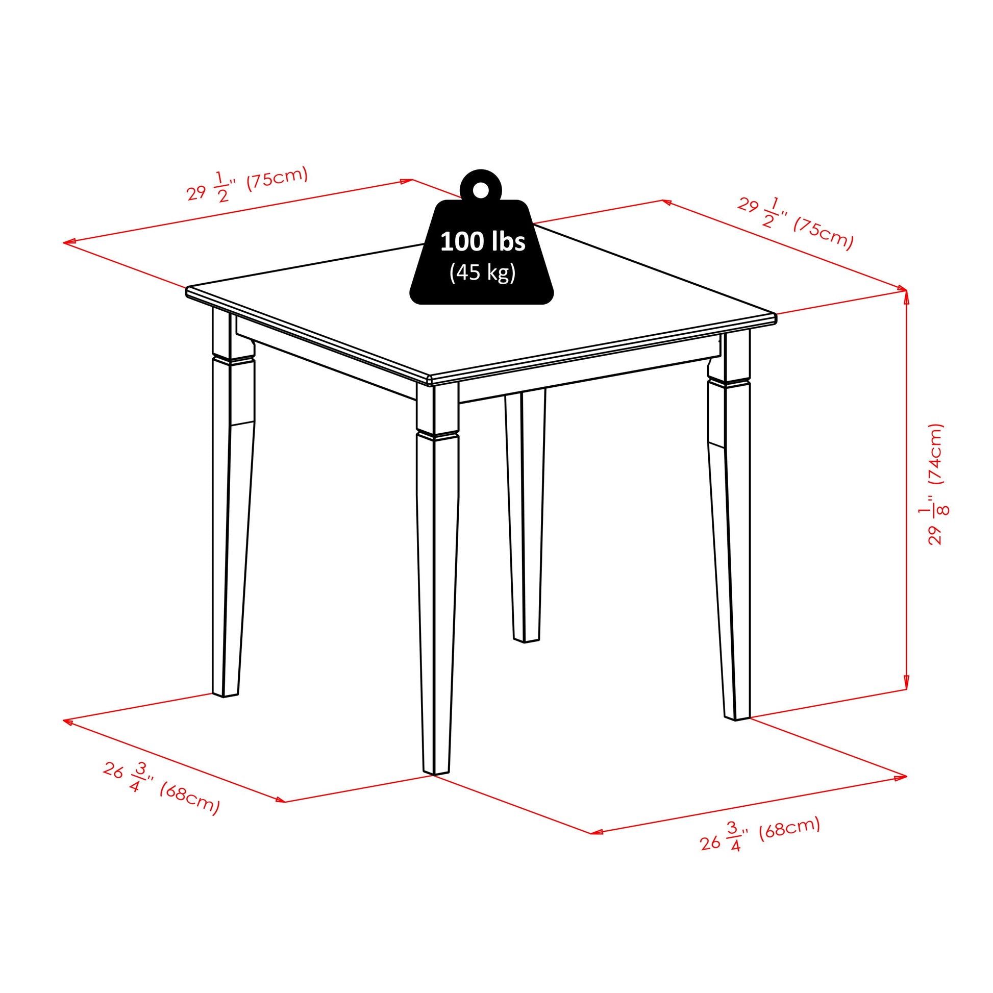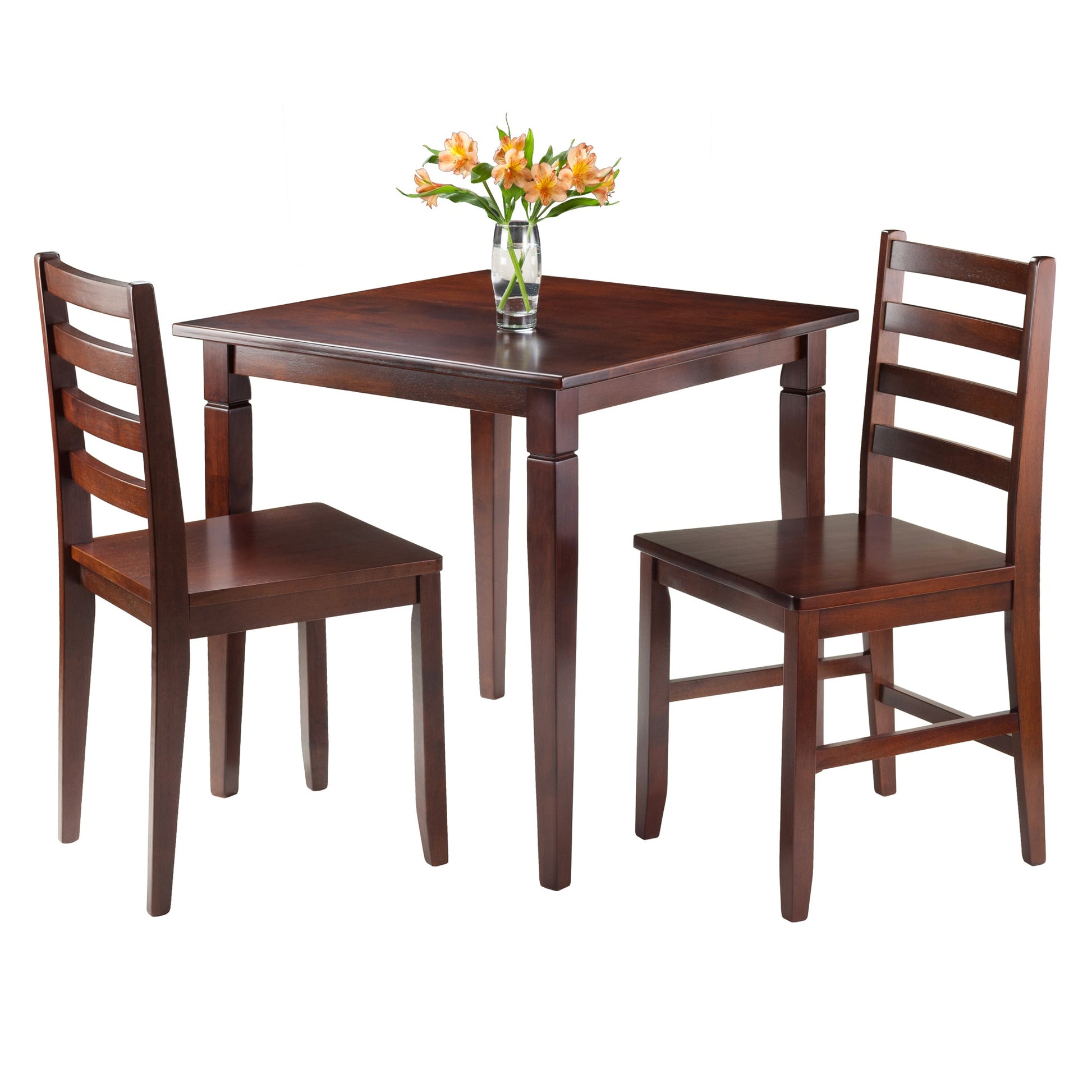 Enhance the look of your casual dining are with this sleek, contemporary 3-Pc Kingsgate Dining Table Set. Compact yet practical, this table offers ample space for dining or entertaining in any area of your home. Table dimensions is 29.53"W x 29.53"D x 29.13"H. The set comes with 2 Hamilton Ladder Back Chairs stands at 16.54"W x 18.63"D x 34.70"H. Seat height from ground is 18" and Seat back height is 17.06". Seat dimension is 16.54"W x 16.46"D. Table and Chairs are made from real wood in warm walnut finish. Table and Chairs required assembly.Dimensions : 29.53 in. Wide 29.53 in. Deep 29.13 in. High