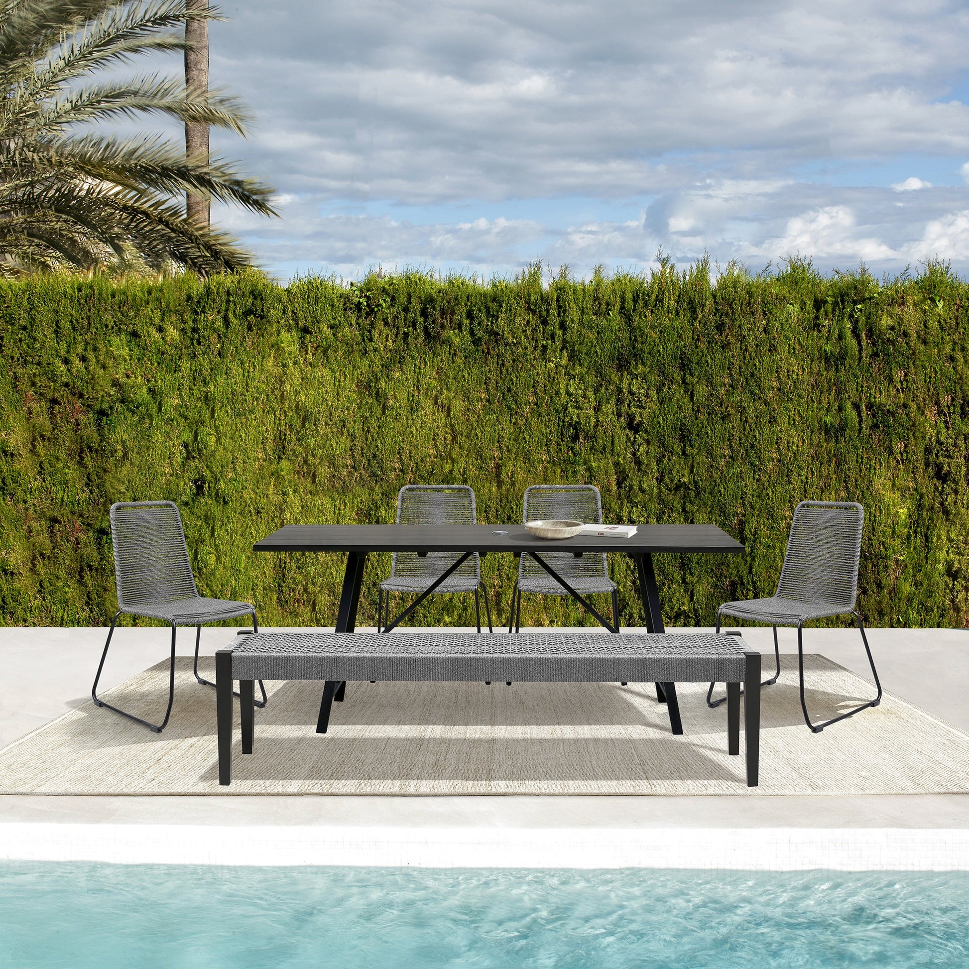 A cohesive indoor and outdoor experience is complete with the Koala Shasta and Camino 6 Piece Outdoor Dining Set from Armen Living. This dining set features 1 Koala Dining Table, 4 Shasta Dining Chairs, and 1 Camino Dining Bench. Modern and inviting, our patio dining table combines the warmth of wood with the hardiness of metal. The clean-lined and minimal profile of the table can effortlessly blend and compliment any outdoor space. One of the best reasons to choose Eucalyptus wood for your outdoor furniture or four-seasons porch is that it is exceptionally resistant to decay and rot. It naturally resists the influence of moisture because of the high oil content it naturally contains. That means it can get damp without you worrying about whether damage will occur. It can withstand several different outdoor elements while lasting for many years if it receives proper care. The Koala’s trestle base allows for maximum seating space as it makes the table virtually legless and allows for the full surface of the table to be used and no corner legs that would limit dining chair space. The intricately woven rope featured on the durable metal frame of the Shasta dining chairs form to offer you extreme comfort and relaxation. This outdoor chair is wrapped in resilient regatta rope cording, providing supple support while still allowing for element passthrough - also enhancing your seating experience with a softness that rivals most fabrics. Each chair is made with the best craftsmanship, with these chairs standing on top of durable metal legs in a black finish for a modern look. For use indoors and out, the soft UV coated nylon cords are hand dyed resulting in subtle tonal variations. The 71-inch-wide Camino dining bench features a unique rope weave which also allows for easy drying if it happens to get wet. The combination of rope and eucalyptus wood offers warmth and texture. This outdoor 5-piece dining set is available with a dark eucalyptus wood finish, black rope on the dining chairs, gray rope on the dining benches, and a black finish on the table and dining chairs.
