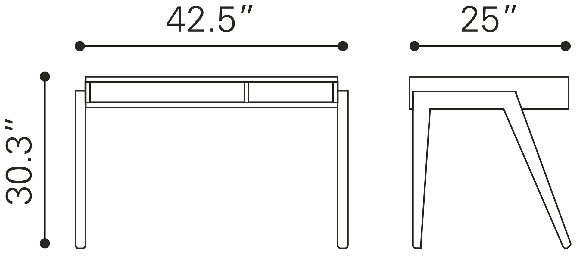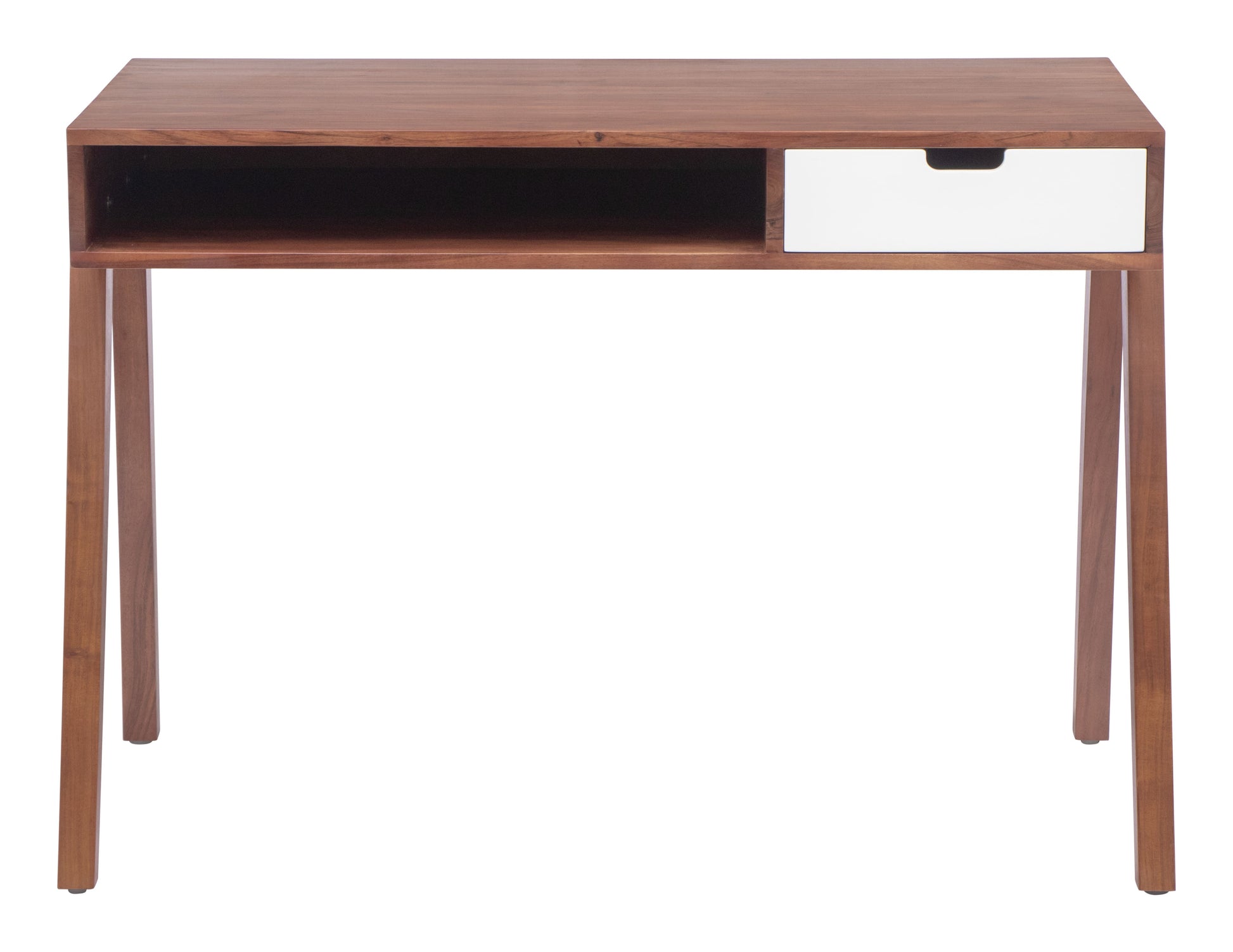 Mid-Century Modern perfection as the angled legs of the Linea Desk support a rectangular top creating a bold and distinctive design. Featuring an open shelf and contrasting bright white drawer; finished in a rich walnut finish. Solid Fir wood.