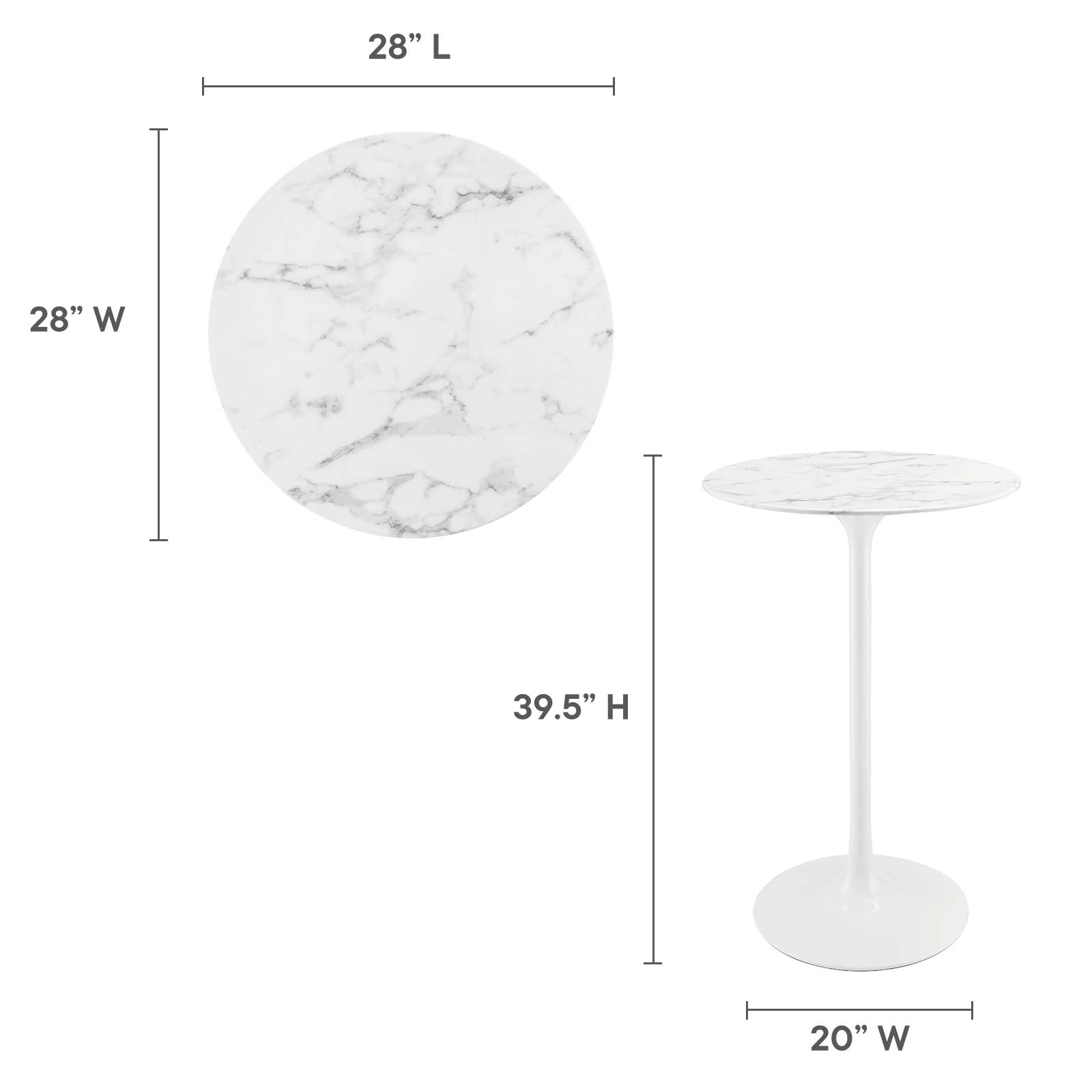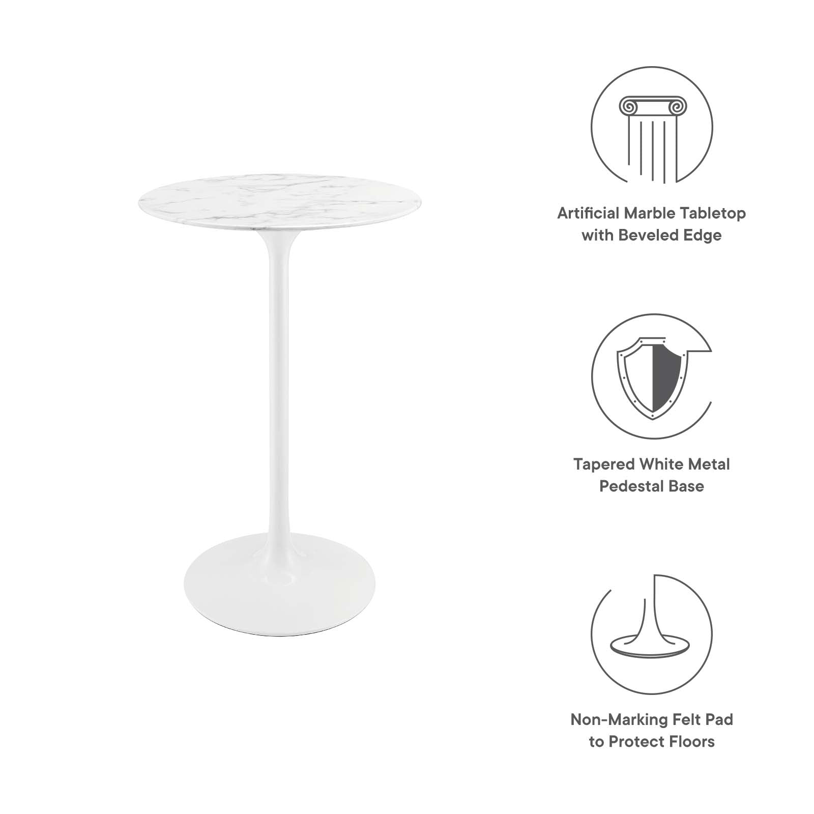 Let modern inspiration flow while gathered around the Lippa 28" Round Artificial Marble Bar Table. Perfect for entertaining family and friends or everyday dining, this pedestal bar table comfortably seats two. Its round tabletop is crafted with artificial marble and features a beveled edge. Embodying an iconic mid-century silhouette, this pedestal bar-height table floats on a sleek tapered metal pedestal base with a chip-resistant lacquered finish. Includes non-marking felt pad to protect flooring. Assembly required.