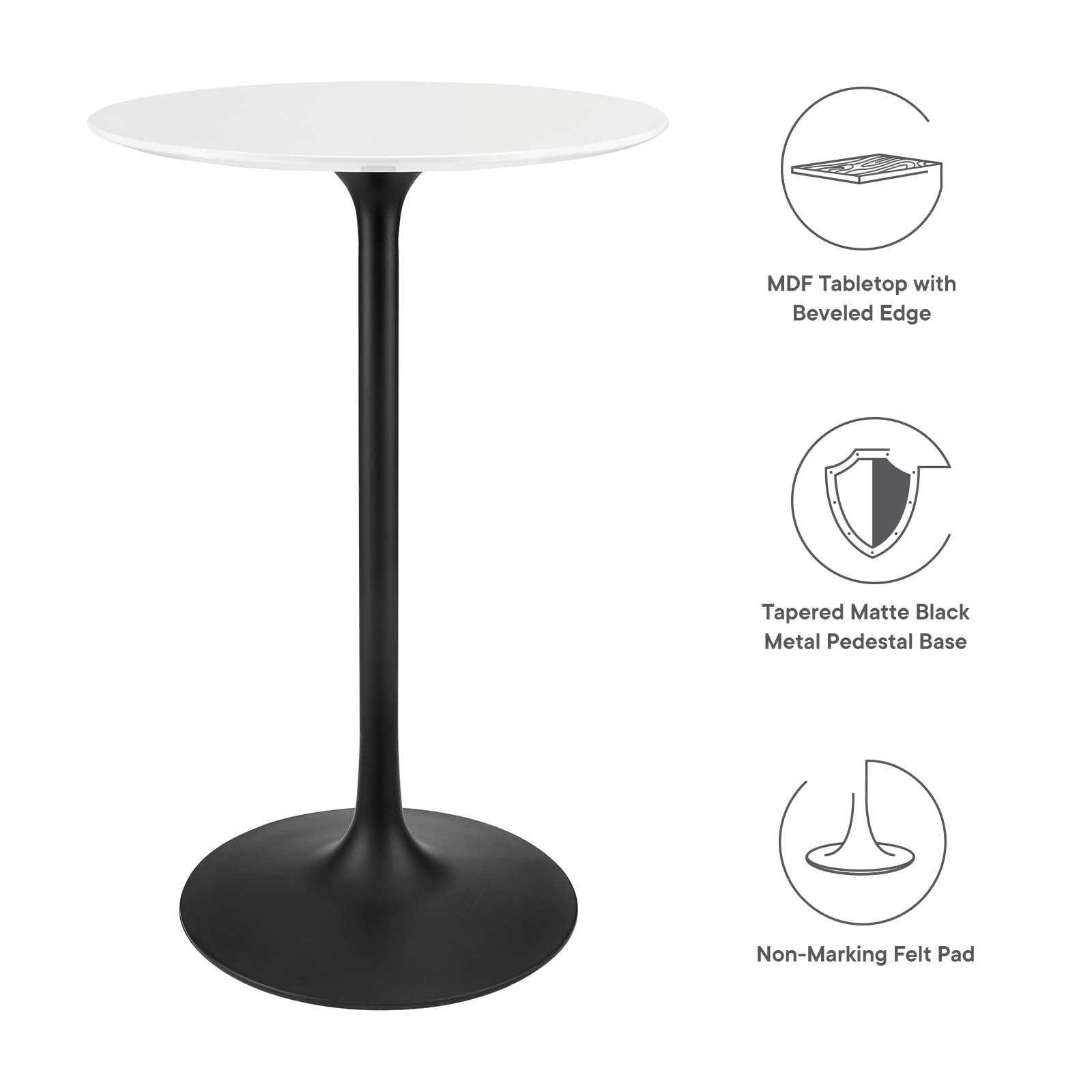 Let modern inspiration flow while gathered around the Lippa 28" Round Bar Table. Perfect for entertaining family and friends or everyday dining, this pedestal table comfortably seats two. Its round tabletop is crafted with MDF with a high gloss finish and beveled edge for a contemporary yet timeless design. Embodying an iconic mid-century silhouette, this pedestal bar-height table floats on a sleek tapered metal pedestal base with a chip-resistant black powder-coated finish. Includes non-marking felt pad to protect flooring. Assembly required.