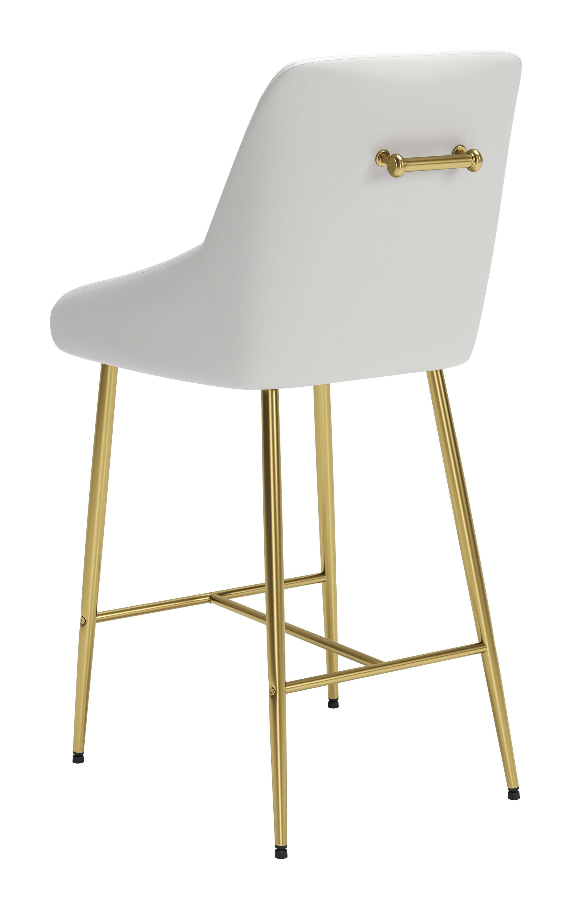The Madelaine counter stool is glam design at its best. Make your kitchen or bar a testament to maximalist design with this counter stool. It has a plush vinyl wrapped seat and back with a matte gold steel frame and back handle.