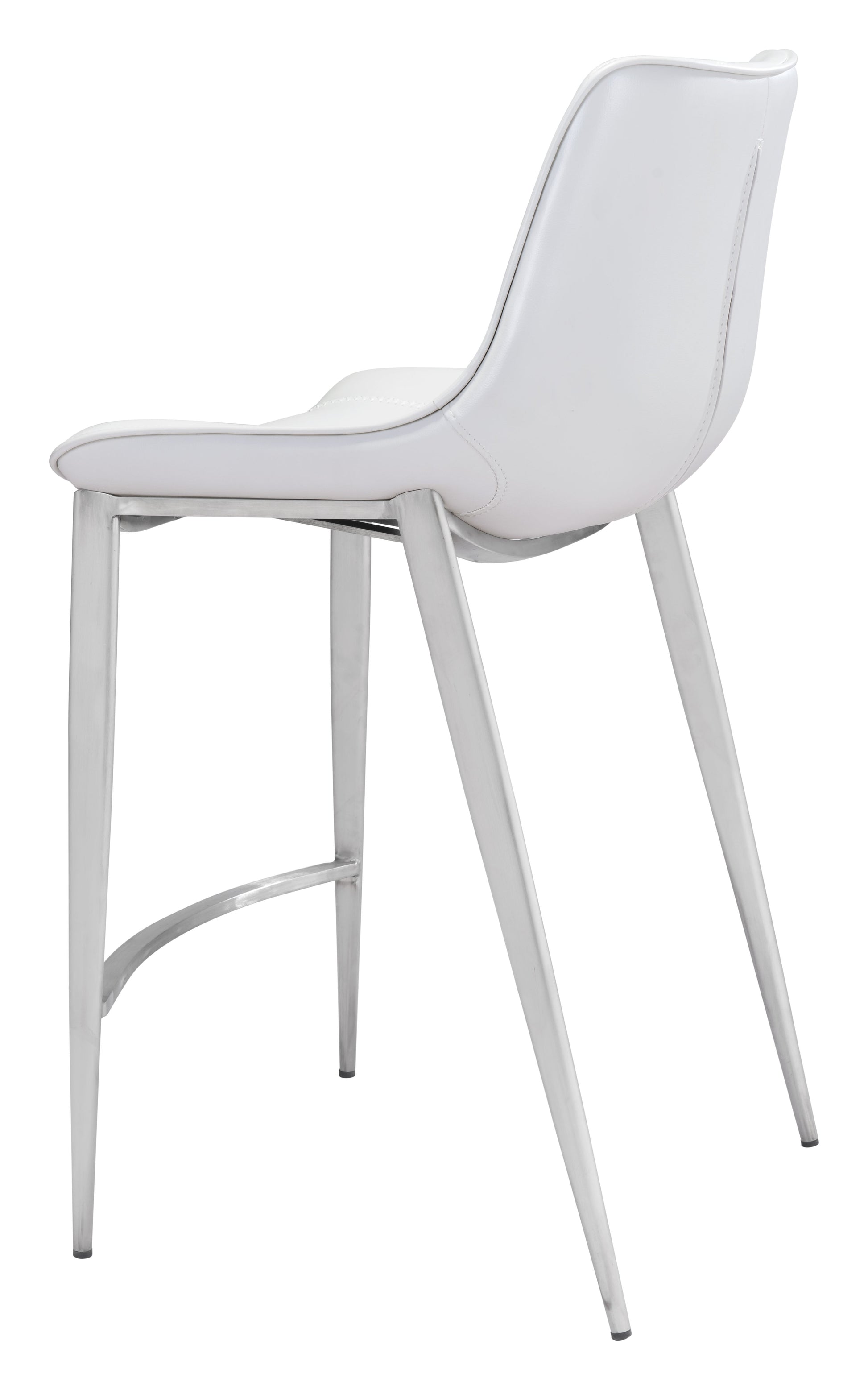 High design meets every day casual. This handsome counter stool with its slim profile pulls up perfectly to the bar. Its super comfortable curved seat is covered in white faux leather with dramatic stitching. Brushed Stainless Steel legs are complete with protective plastic feet to keep your floors scratch-free.