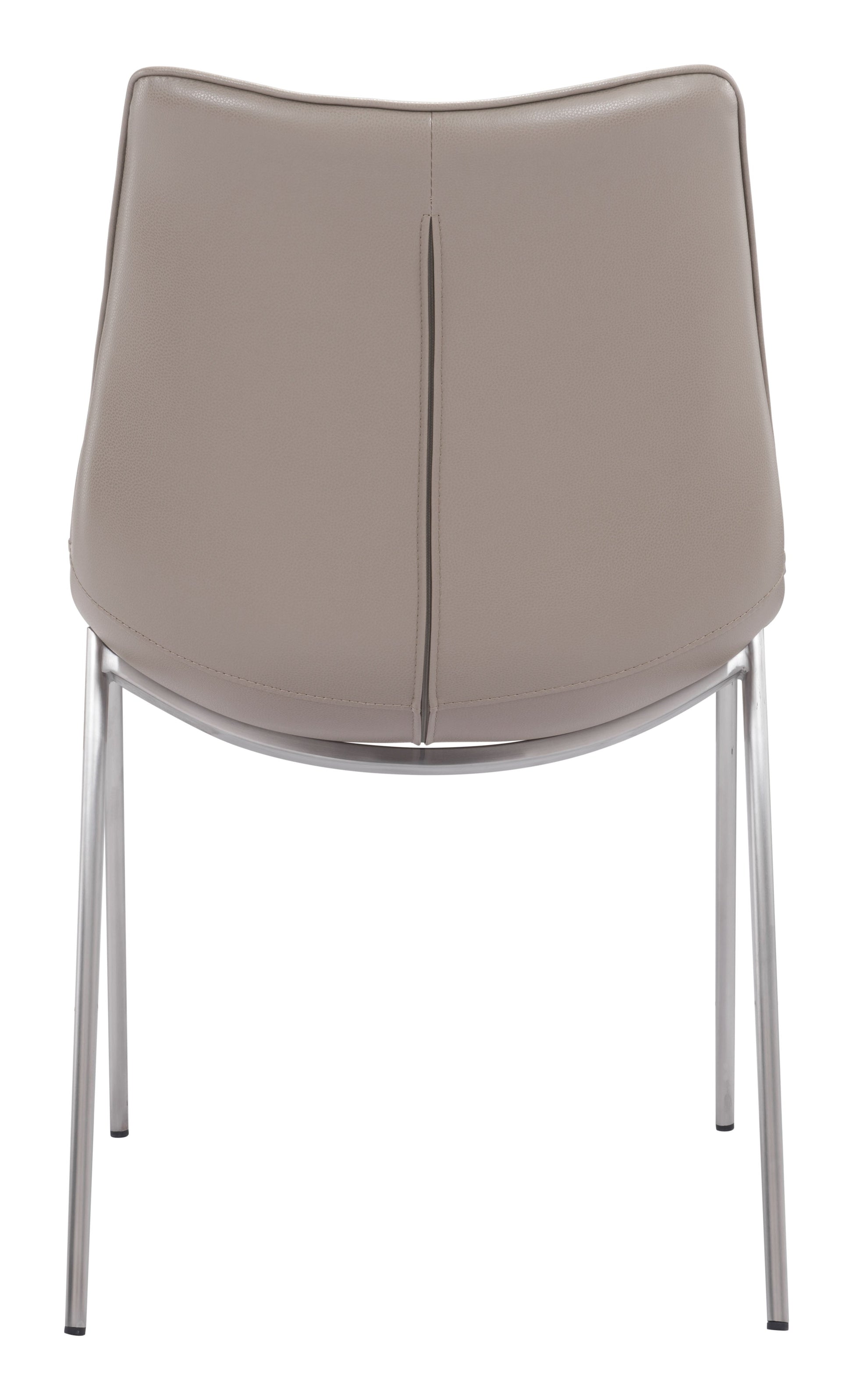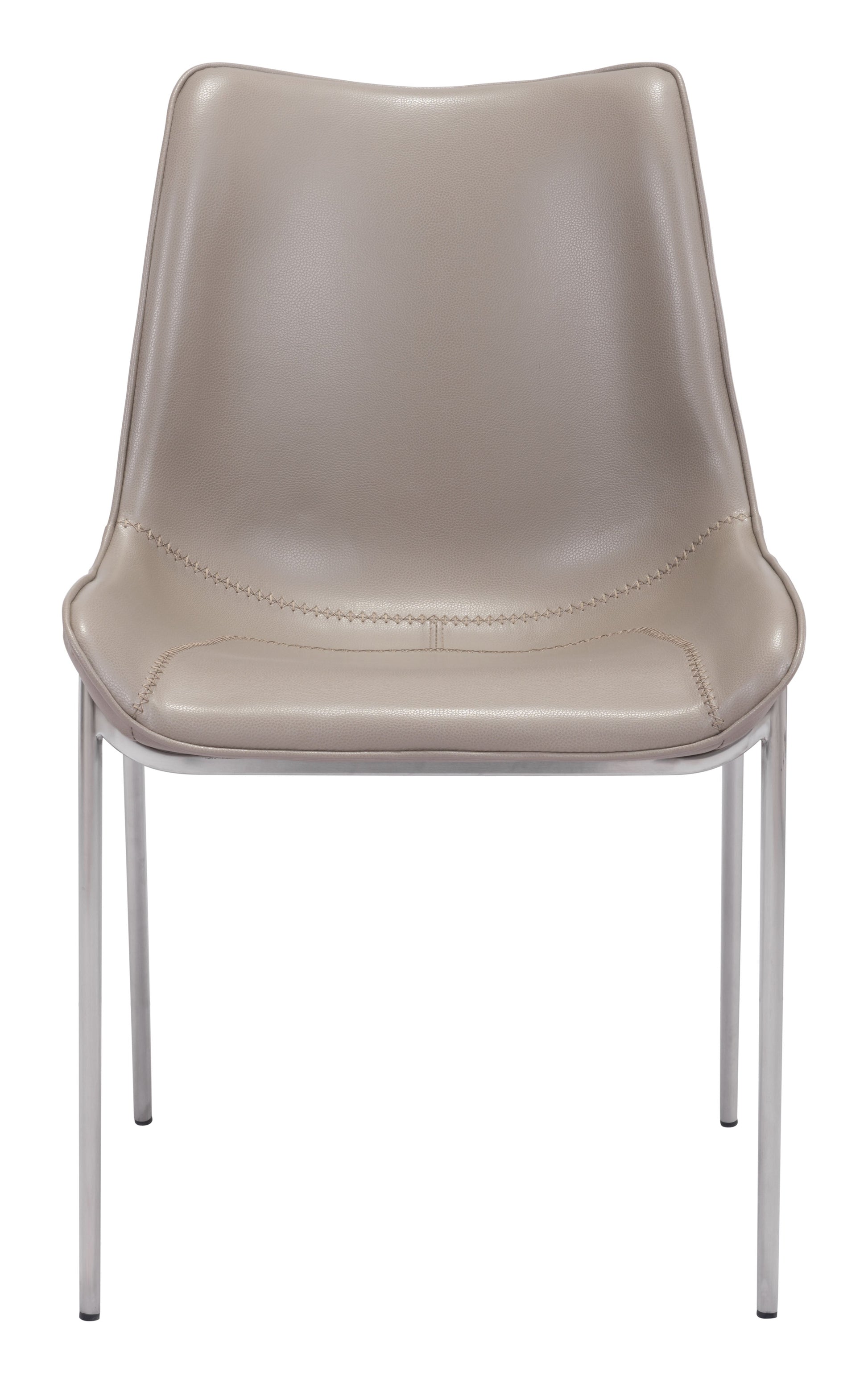 This armless contoured chair with its simple silhouette can dress up your dining space or keep things casual. Beautifully stitched design on gray faux leather keeps an eye on the details. Comfortable enough to use as a desk chair. Brushed Stainless Steel legs are complete with protective plastic feet to keep your floors scratch-free.