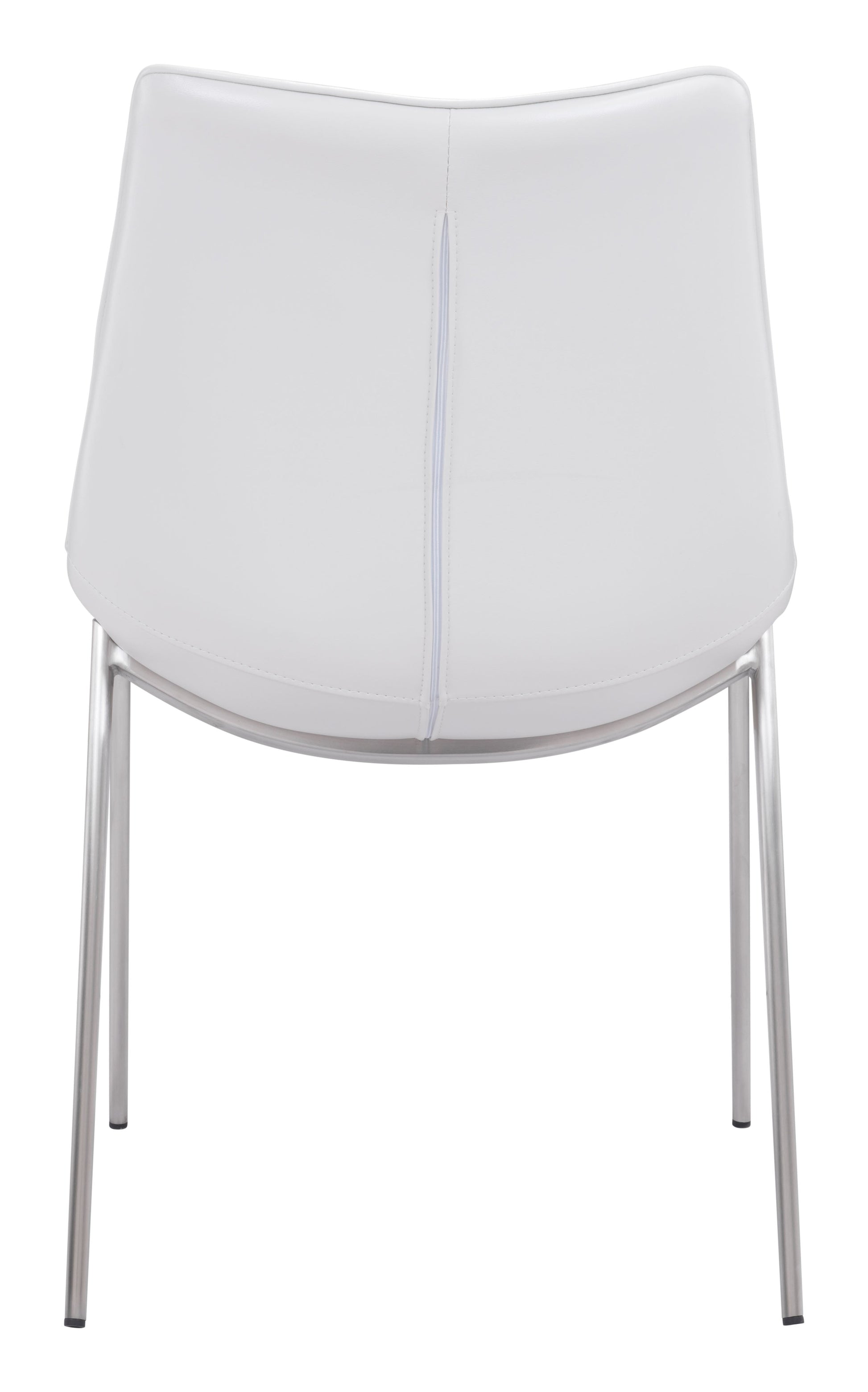 This armless contoured chair with its simple silhouette can dress up your dining space or keep things casual. Beautifully stitched design on white faux leather keeps an eye on the details. Comfortable enough to use as a desk chair. Brushed Stainless Steel legs are complete with protective plastic feet to keep your floors scratch-free.