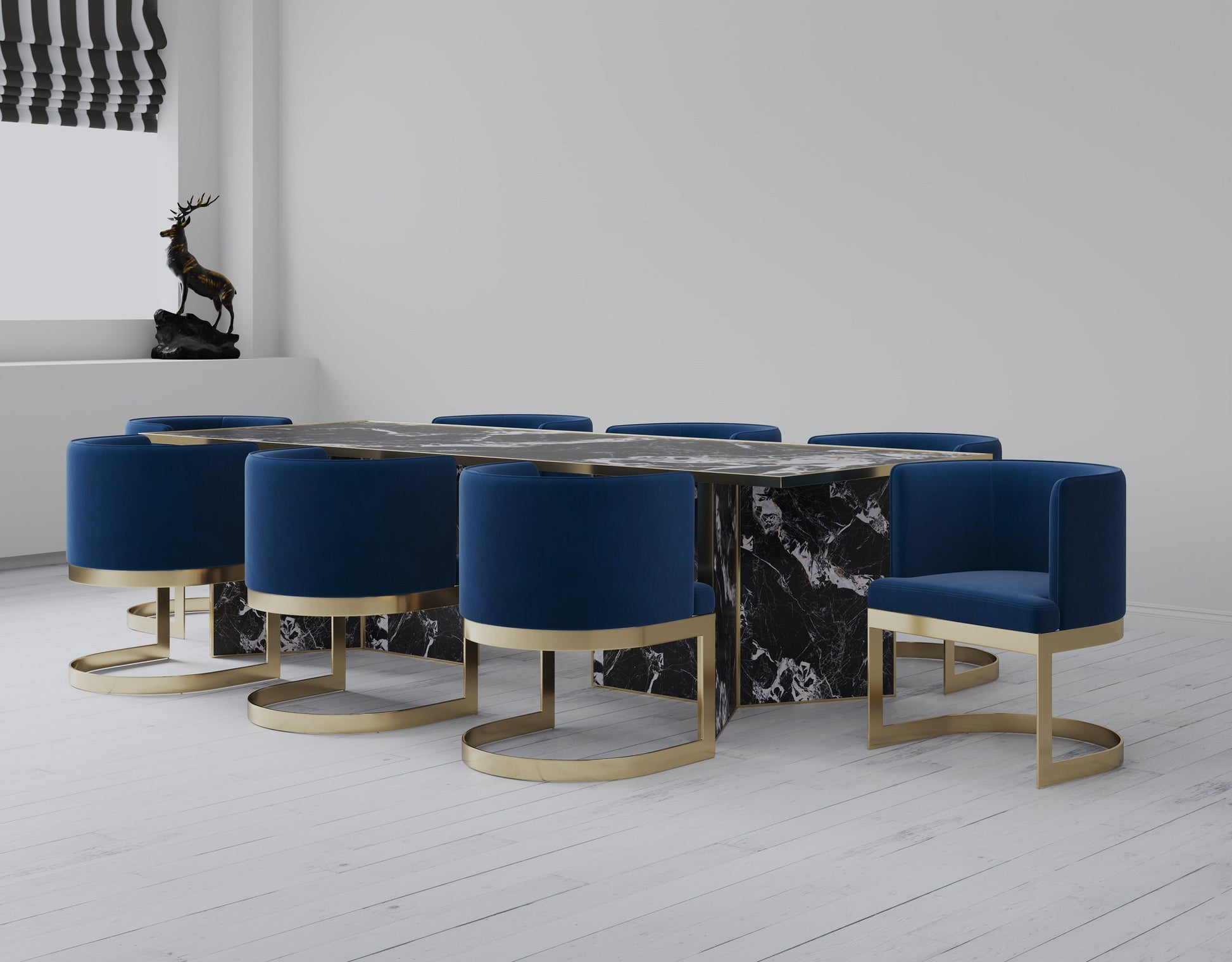 Each chair is upholstered in plush velvet, tailored into a sleek seat that promises comfort during long dinners and gatherings. The polished metal base not only enhances the effortless feel of the chair but also ensures durability and stability. The chic polished brass finish adds a subtly sumptuous touch, elevating the overall atmosphere of your dining area.