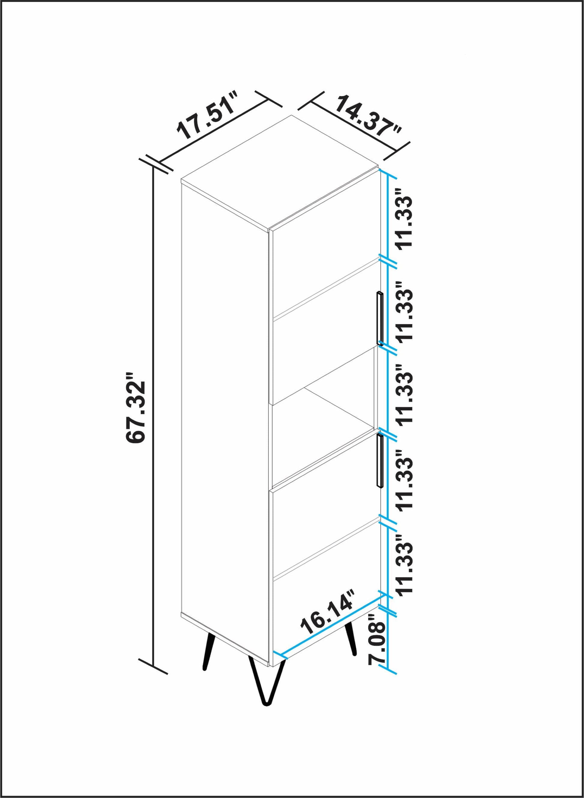 Mid-Century office vibes? We've got you covered with the Beekman cabinet serving up sophisticated and classic Mid-Century Modern style. Splayed metal legs, sleek dark cabinet hardware, and concealed shelving and drawers, make this piece the perfect office or bedroom must. Two columns of shelves provide ample space for files or your favorite sweaters. Whether its style accessories or work related electronics and documents, this piece is easy to style, great in an apartment or office, and instantly makes you look way more professional and organized. Dimensions: 17.51 in. Length, 67.32 in. Height, 14.37 in. Depth.