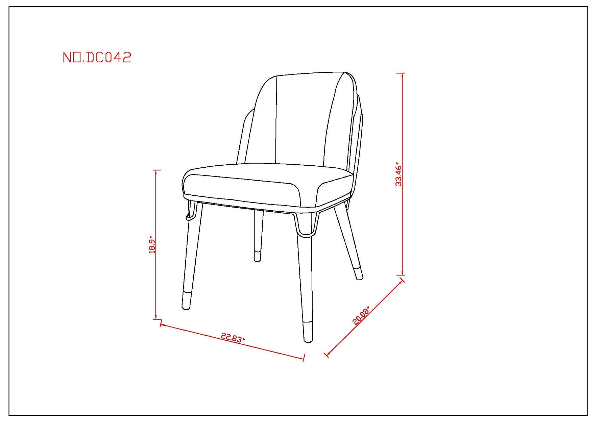 Exquisite craftsmanship and transitional design merges to bring you the Estelle dining chair. Clad in rich, luxurious leather, the …dining chair is inviting and eye-catching. A narrow, upholstered side rail gracefully ascends from the seat making this cleverly sculpted chair, not an arm chair or a side chair but both. The front and back legs are elegantly embellished with elongated gold metal ferrules, and completed with matching accents at the seat's base. modern details adorn this Mid-century inspired seat, creating a versatile look to match a variety of home decor styles. You will fall in love with the sophistication, and comforting construction of the Estelle dining chair. Dimensions: 20.08 in. Length, 33.46 in. Height, 22.83 in. Depth.