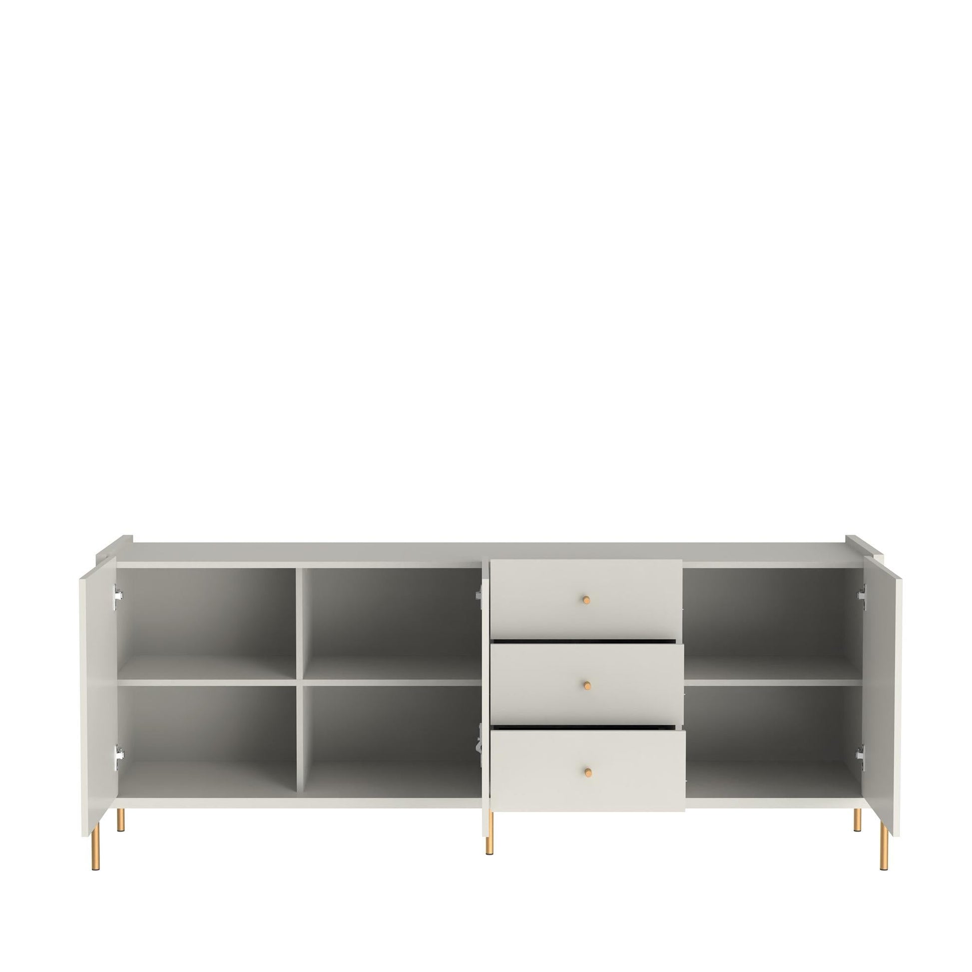 If you are searching for a modern sideboard with a touch of glam chicness, look no further. The Jasper has it all, from clever sleek storage to gorgeous gold details, so your dining space will wow. Offering three cabinet doors, and three full extension drawers, storage is an issue of the past. The Jasper's beautifully gold brushed accents and legs give an eye-catching elegance that completes any dining room or entertainment space. Dimensions: 72.51 in. Length, 29.52 in. Height, 17.59 in. Depth.