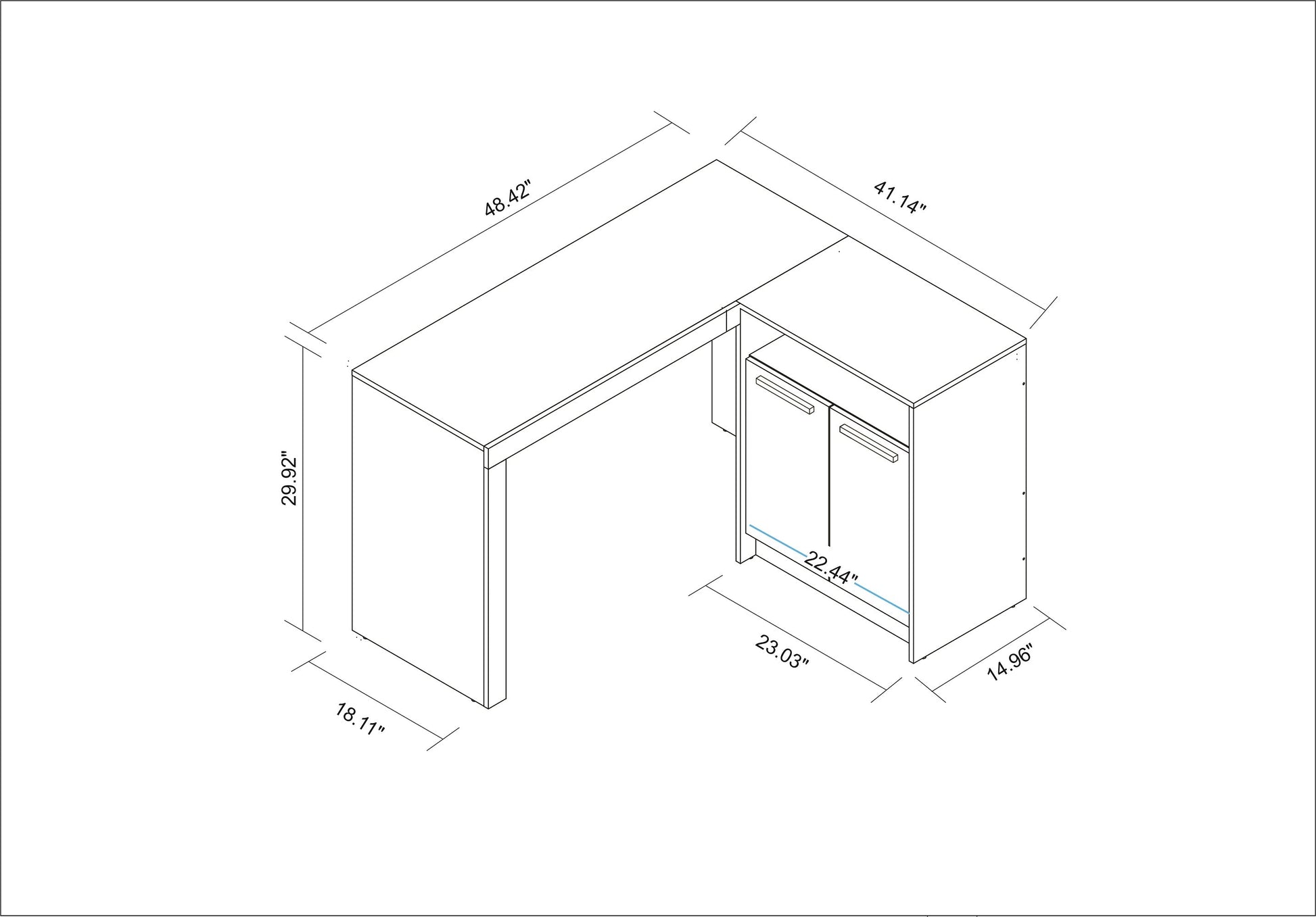Work all day and night with the Kalmar Office Desk. Its class L design, and inclusive cabinet allows you to work with a clear head. Its wooden bar handle adds a fresh taste of Mid-Century- Modern design. This desk is both fun and functional. Dimensions: 48.43 in. Length, 29.92 in. Height. 41.14 in. Depth.