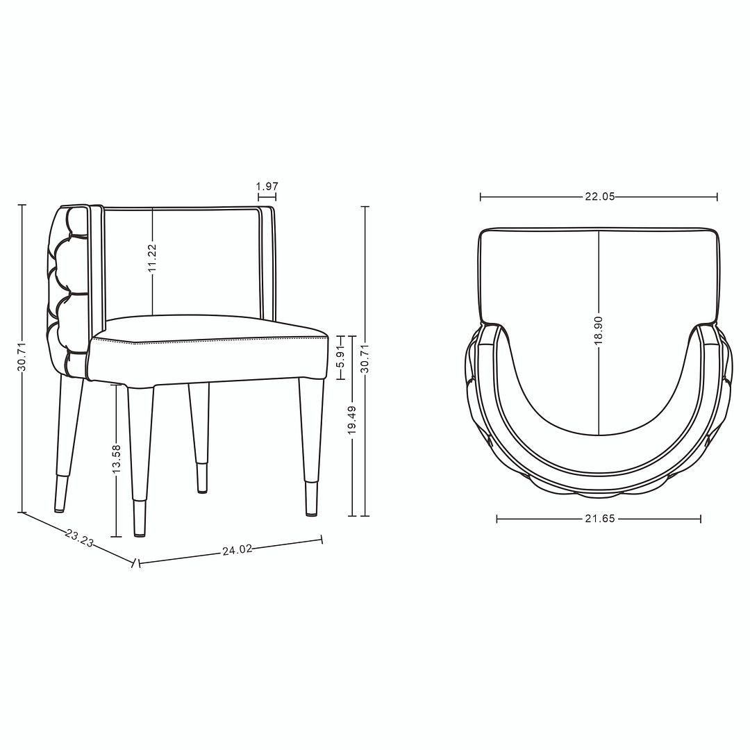 Transform your dining room or workspace with our exquisite Modern Maya Dining Chair. Crafted with precision, it features a high-quality Elm Wood frame adorned with metal brushed gold tips for a blend of fashion and durability. Luxurious velvet upholstery, complemented by high-density foam padding, guarantees unmatched comfort. The stunning back tufted buttoning and rounded back frame add a touch of elegance to any setting, while its commercial-grade build ensures it can support up to 330 lbs. Delivered fully assembled, it's the hassle-free choice to infuse style and comfort into your space. Dimensions : 24.02 in. Length, 30.71 in. Height, 23.23 in. Depth.