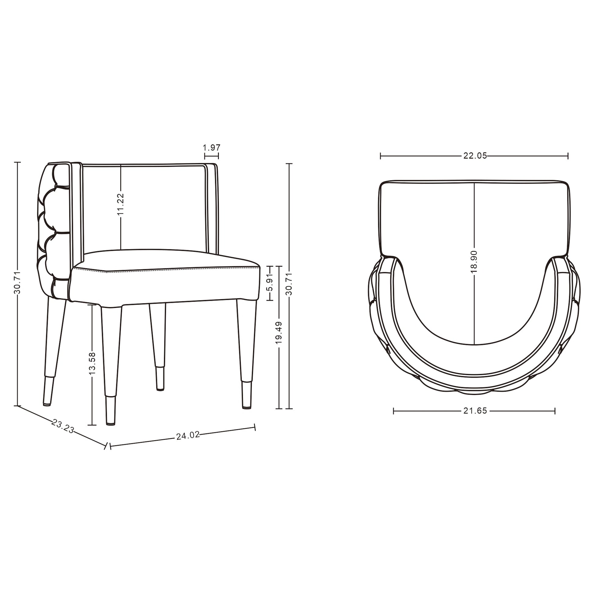 Transform your dining room or workspace with our exquisite Modern Maya Dining Chair. Crafted with precision, it features a high-quality Elm Wood frame adorned with metal brushed gold tips for a blend of fashion and durability. Luxurious velvet upholstery, complemented by high-density foam padding, guarantees unmatched comfort. The stunning back tufted buttoning and rounded back frame add a touch of elegance to any setting, while its commercial-grade build ensures it can support up to 330 lbs. Delivered fully assembled, it's the hassle-free choice to infuse style and comfort into your space. Dimensions: 24.02 in. Length, 30.71 in. Height, 23.23 in. Depth.
