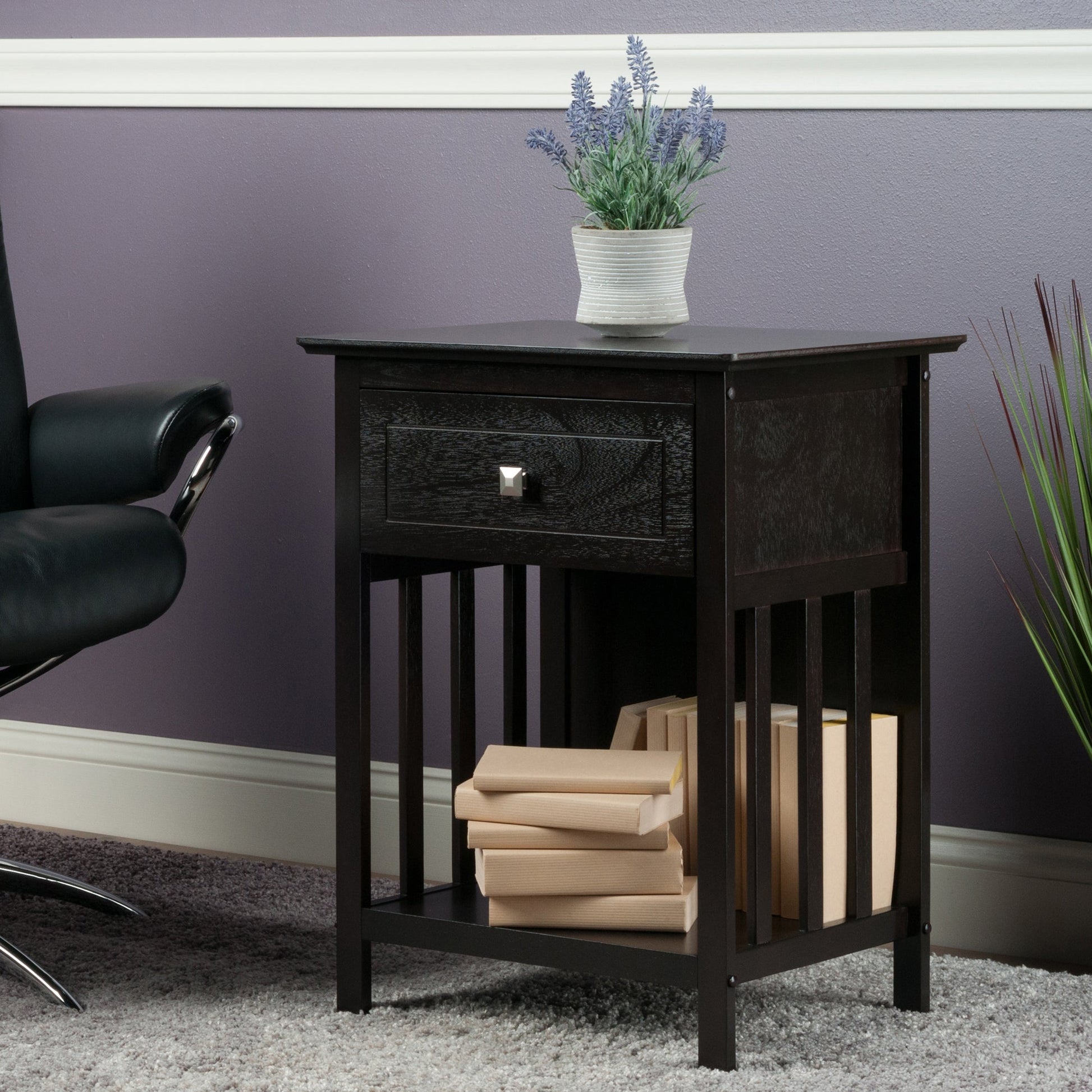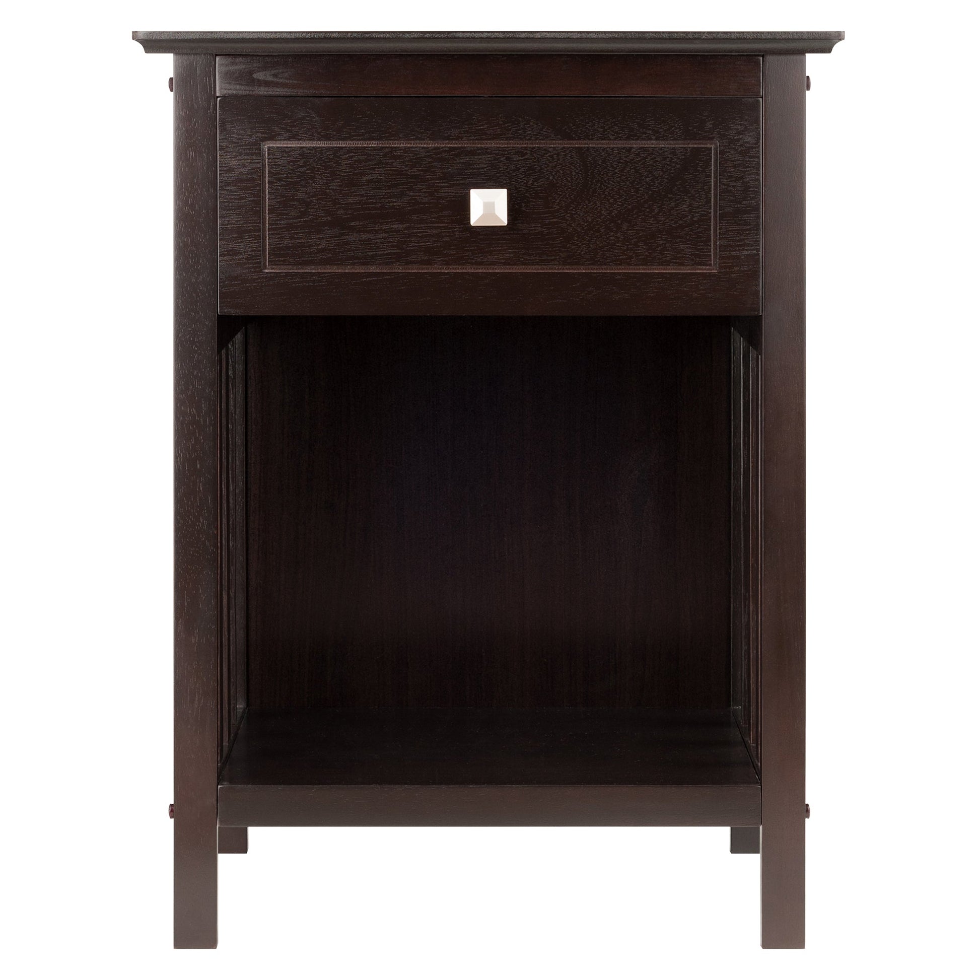The Winsome Wood Marcel 1-Drawer Nightstand includes eye-catching details such as mission-style slatted sides, a full-sized drawer, and step-cut hardware. Use this all-around end table in the living room next to the sofa, as a bedside table, or a printer stand in your home office. The lower shelf is ideal for keeping books and magazines, and the ample drawer is great for storing TV remotes and charging wires out of sight, yet within easy reach for your convenience. Constructed of sturdy solid and composite wood in a dark coffee finish that can easily mesh with most home decors. For larger beds, sofas or rooms, try adding one accent table on each end to unify the space (each sold separately). Conveniently packed and shipped in 1 box that includes the hardware necessary for assembling. Replacement part request can be submitted directly to the manufacturer within 60 days from date of purchase.