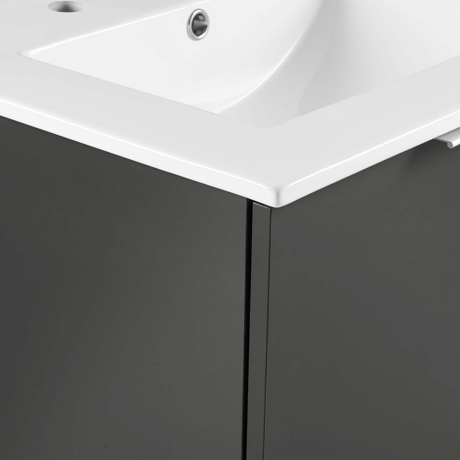 Incorporate modern aesthetics and contemporary style into your bathroom decor with the Maybelle 24" Bathroom Vanity. This vanity features a durable melamine construction with ample storage space for all your bathroom essentials behind two soft-close hinge doors with metal L-shaped handle pulls. Continuing the look of this modern vanity is a ceramic sink with an integrated countertop and 8" centerset faucet holes. Mounting directly to the wall, this bathroom sink vanity saves a substantial amount of floor space. Assembly required. Sink fixtures not included.