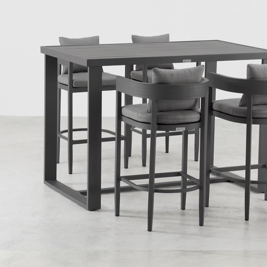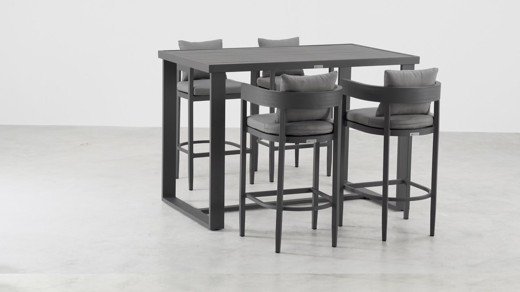 Transform your backyard space into the perfect entertainment destination with the Menorca Outdoor Patio 5-Piece Bar Set from Armen Living. This bar height dining set comes with 1 rectangular pub table and 4 metal barstools. The chic aluminum outdoor bar stool frame and table feature a multi-layer powder coating for effective protection from the UV, rust, weather, everyday wear, and tear. The slat style tabletop helps elements to easily pass through which adds to its durability, making it the ideal outdoor patio furniture set. The Menorca stools with backs feature a beautiful wrap around style arm design that seamlessly ties the back and arms to the seat and legs, creating a harmonious aesthetic. The dark gray cushions not only feature high density foam that will allow for many hours of comfortable seating; the cushions also feature a zipper closure that allows for easy removal and cleaning! Aluminum is a light material, and this set is easily portable which makes it a durable outdoor furniture piece! Enjoy the view whether you’re in your back yard, patio, screened in porch, garden or poolside! The Menorca 5-Piece Bar Height Dining set supports up to 308lbs per seat, features a 30-inch seat height, and is available in a dark gray finish with dark gray upholstery.