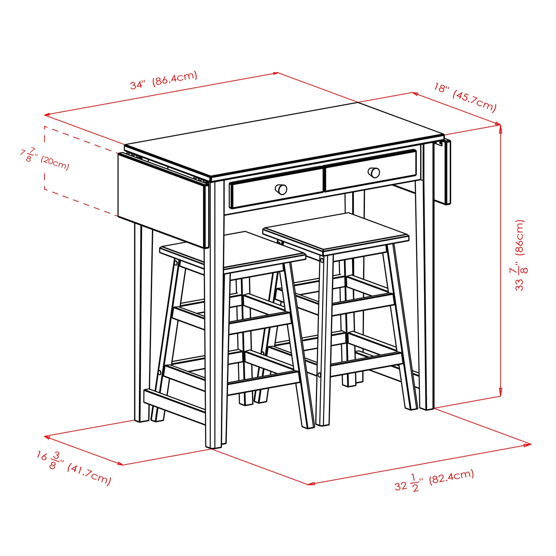 The Winsome Wood Mercer Double Drop Leaf Island with Stools is a perfect spot for breakfast in the kitchen or a casual meal in the den. The table has double drop leaves to extend the table wide enough for dinner for two or a possible work-at-home space with plenty of room to spread out. Ideal for apartment living or smaller rooms, the leaves fold and the two stools can be stowed underneath. Two drawers in the table provide space for cutlery, napkins, or the odds and ends that always seem to migrate to an "everything" drawer. The stools have squared legs and double crossbars for stability, and they can be used as extra seating when guests arrive. The set is made of solid wood in a smooth cappuccino finish. Conveniently packed and shipped in 1 box that includes the hardware needed for assembly.