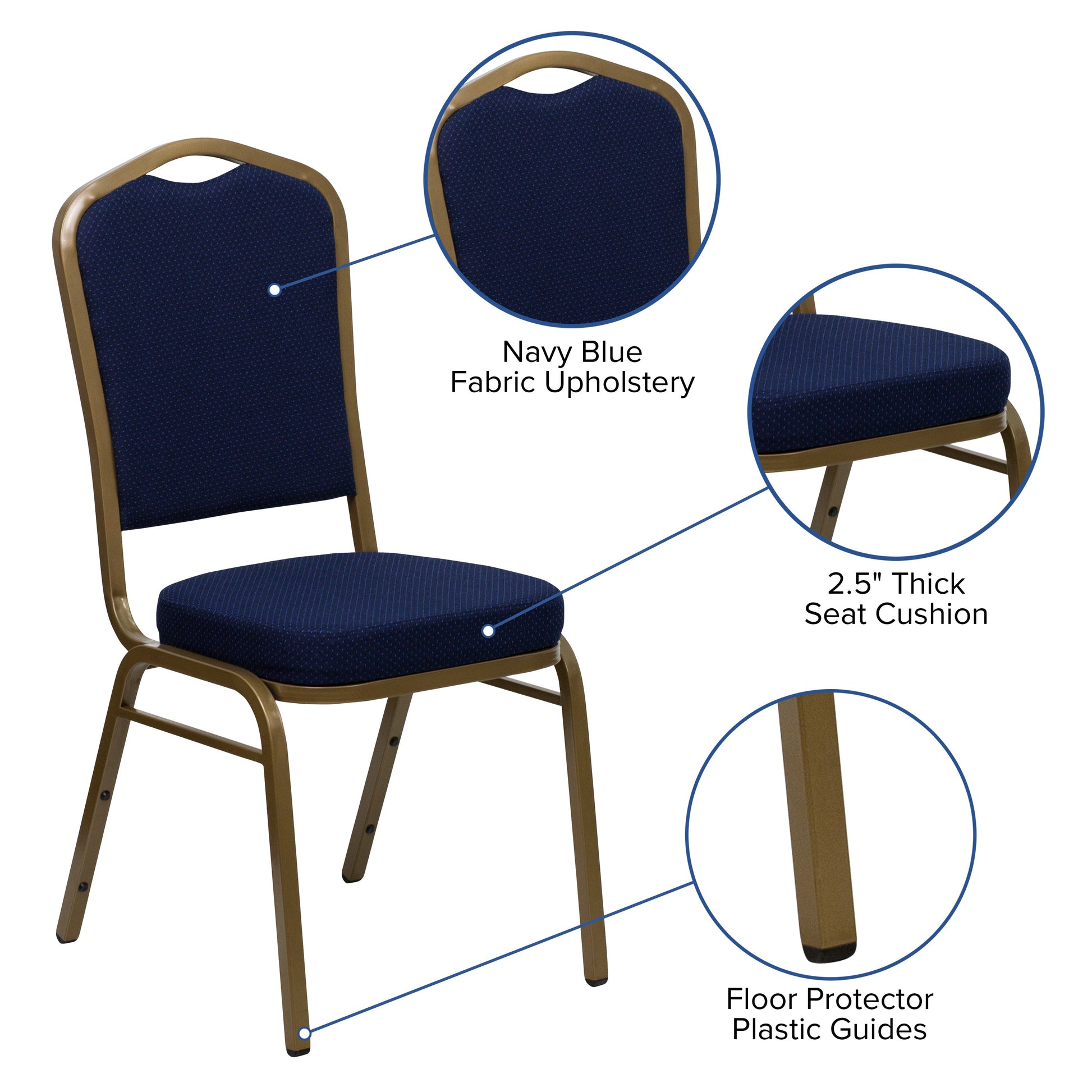 HERCULES Series Crown Back Stacking Banquet Chair in Navy Blue Patterned Fabric - Gold Frame Dimensions: 17.25"W x 20.25"D x 38"H