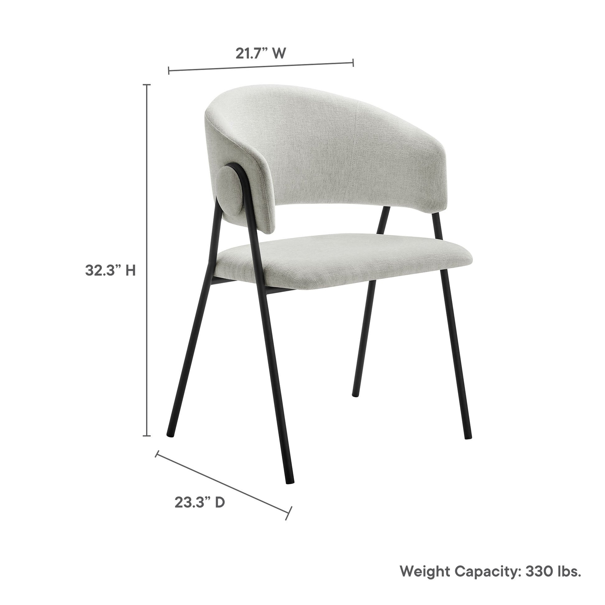 Perfect for those who appreciate a mix of contemporary and mid-century styles, these accent dining chairs introduce a tasteful highlight to any space. With a weight capacity of 330 lbs, you can enjoy both comfort and durability. The overall product dimensions are 21.5" L x 23" W x 32.5" H, with a seat dimension of 18" L x 21" W x 19" H, an armrest dimension of 21.5" W x 27" H, and a backrest height of 13" H. The cushion thickness is 2" H, and the base dimension measures 16.5" L x 22" W.