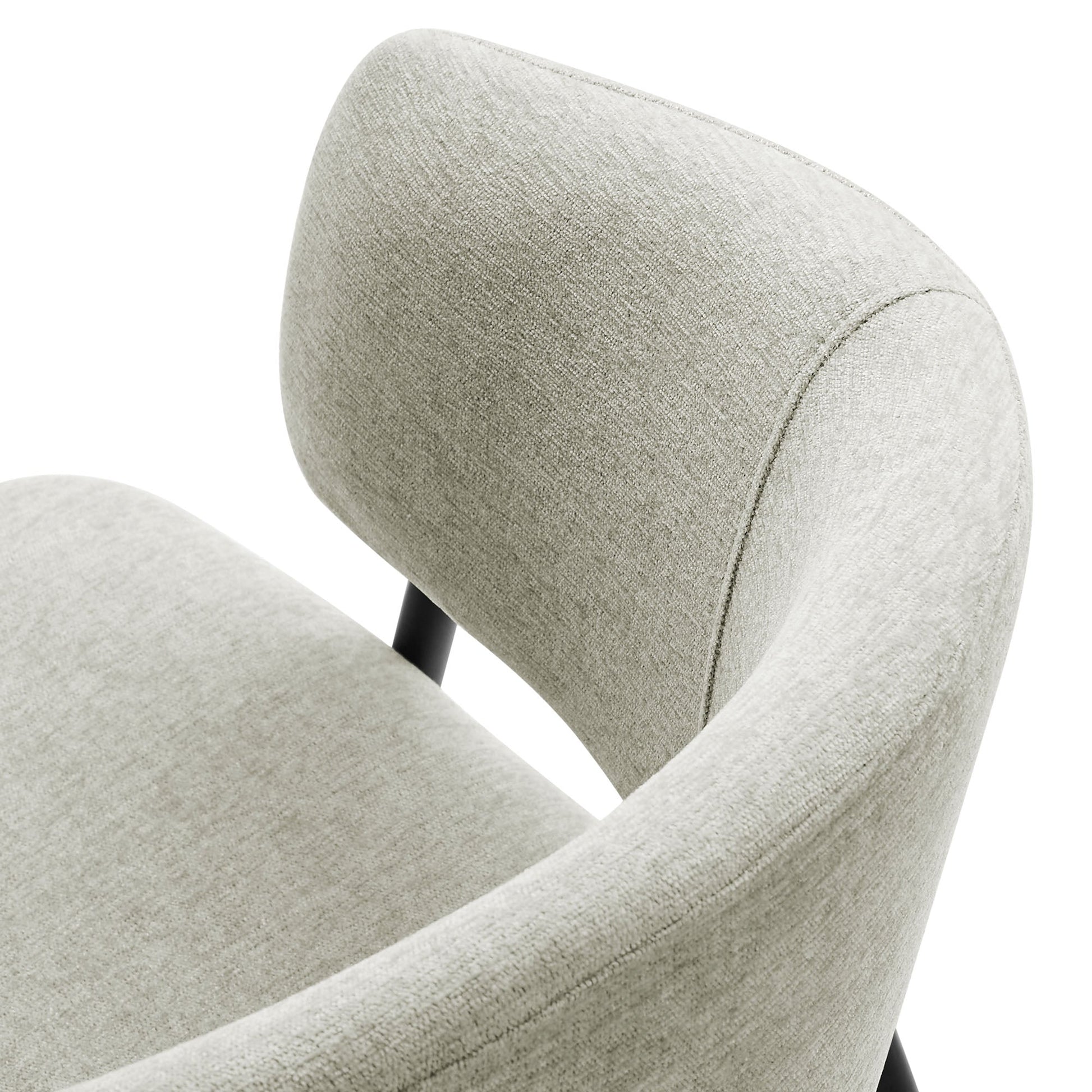 Introducing a stunning set of dining room accent chairs that effortlessly blend vintage charm with versatile functionality. Each chair is elegantly upholstered in your choice of luxurious heathered chenille or stain-resistant performance velvet, featuring a stylish gap between the seat and backrest that shapes the elegant contour of an open back armchair. This set of two barrel dining chairs stands on splayed metal legs that gracefully ascend and curve around a decorative round button, enhancing the retro aesthetic of these club chairs.