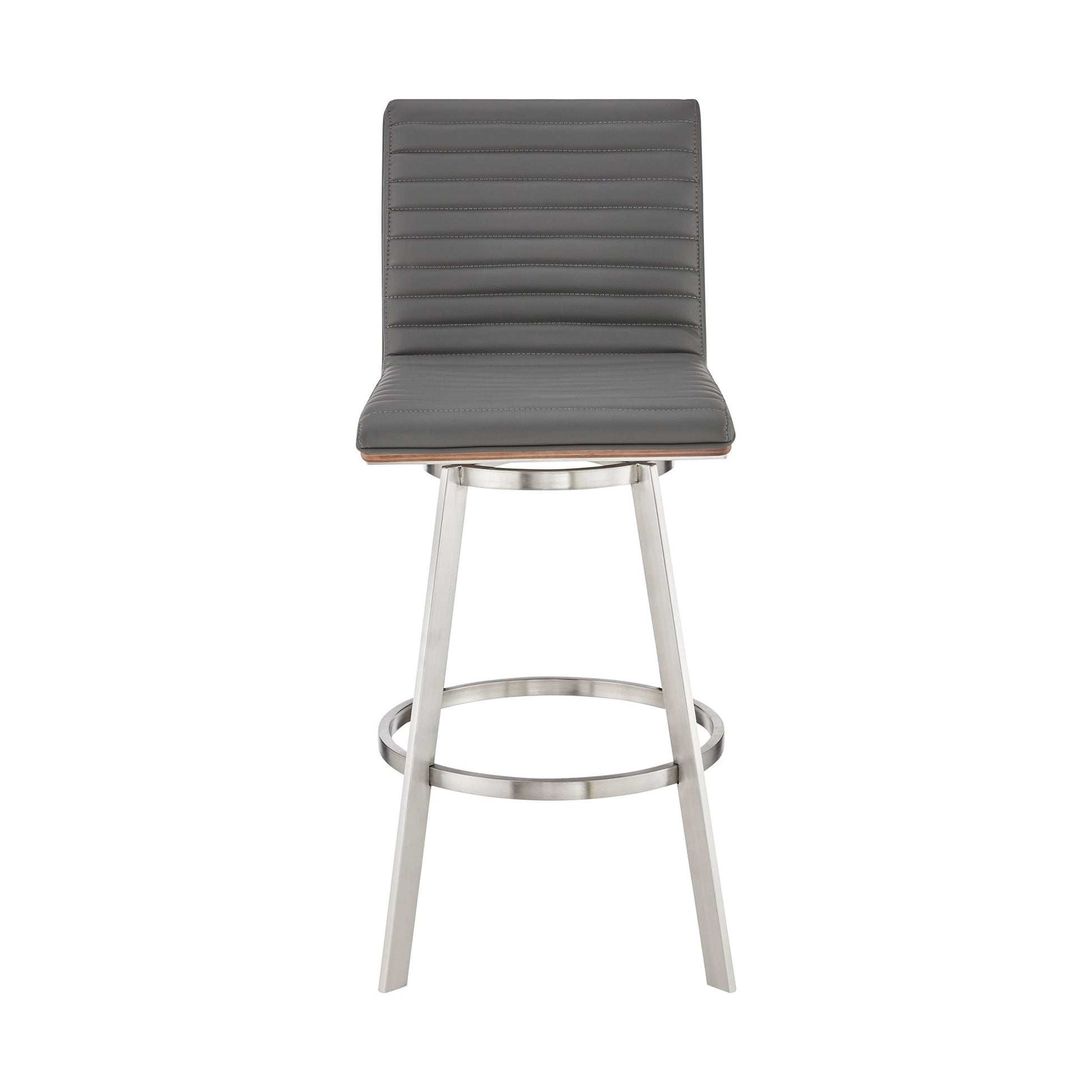 Bring the Nikole Swivel Bar Stool from Armen Living into your beautiful home! It is the best choice to bring in another seating option and does so without compromising on comfortability. The wonderful faux leather and metal accents give the Nikole a look of refinement, making you proud to show it off in your home. The foam-padded seat and back cushion offers you the most comfort available to you! The Nikole also features a brushed wood veneer back and convenient metal footrest, for additional support and stability. The Nikole comes in a variety of color and finishes; gray faux leather with black metal or brushed stainless steel finishes and black brushed wood back, or walnut finished back. All color options are available in your choice of 26" counter height and 30" bar height.