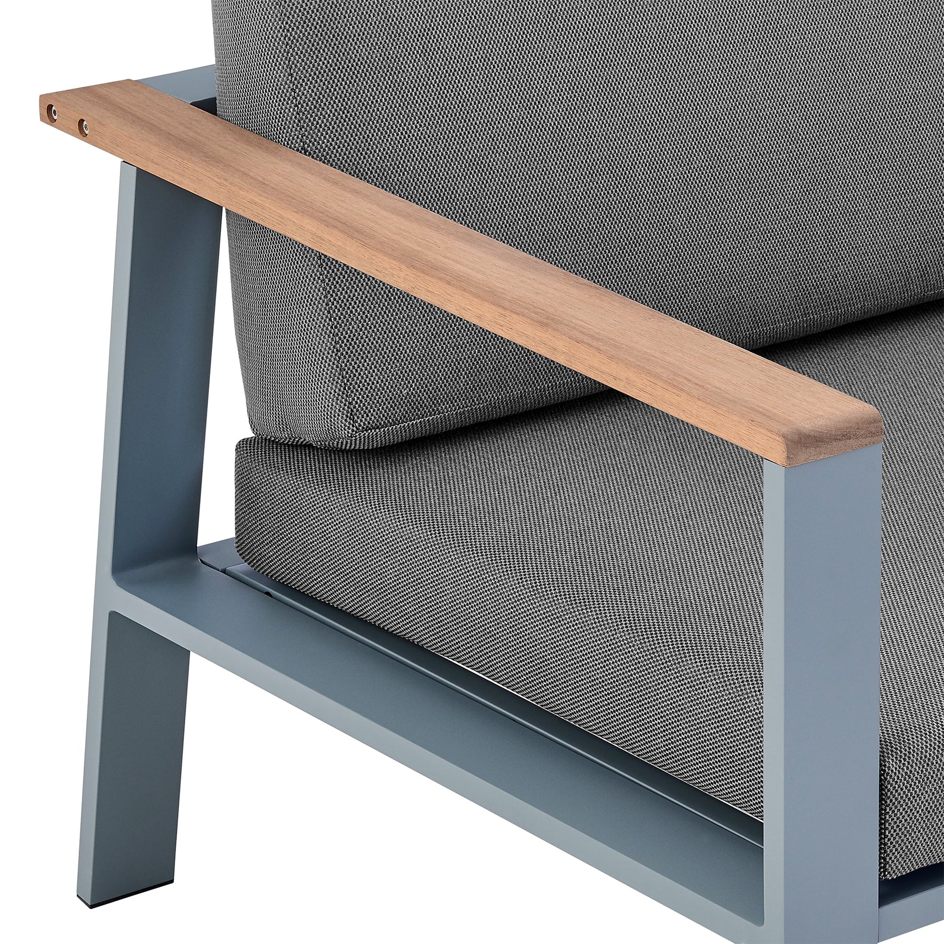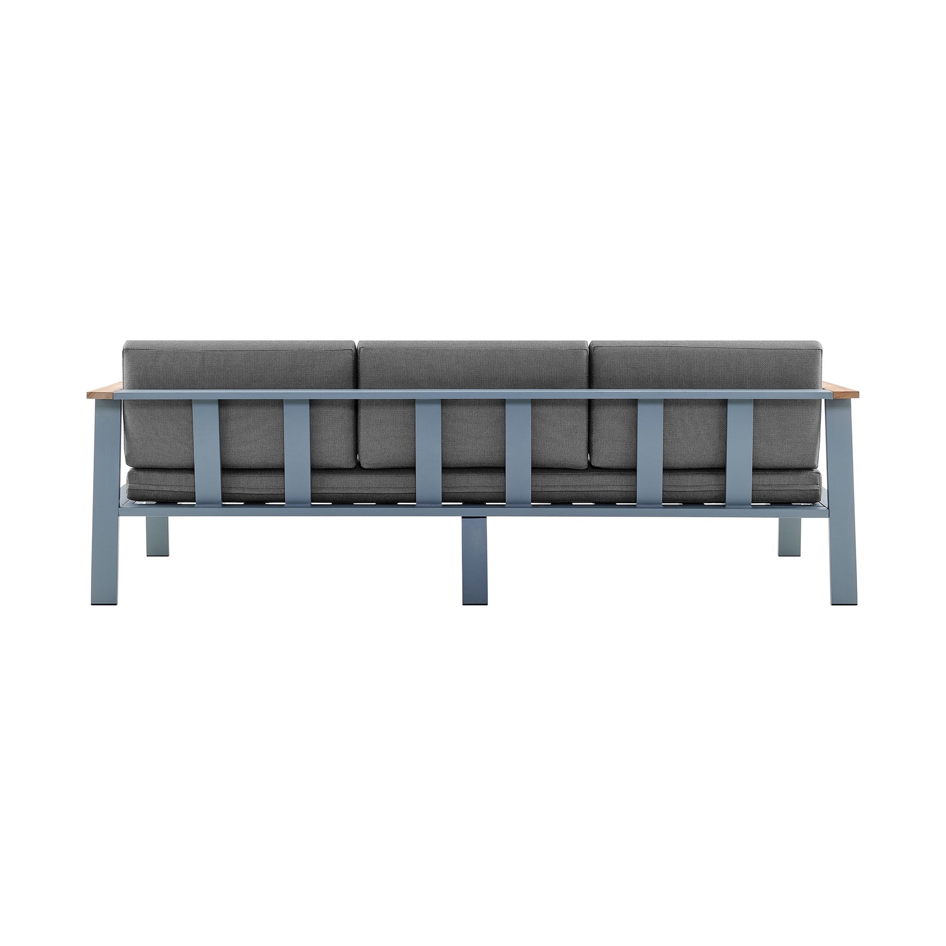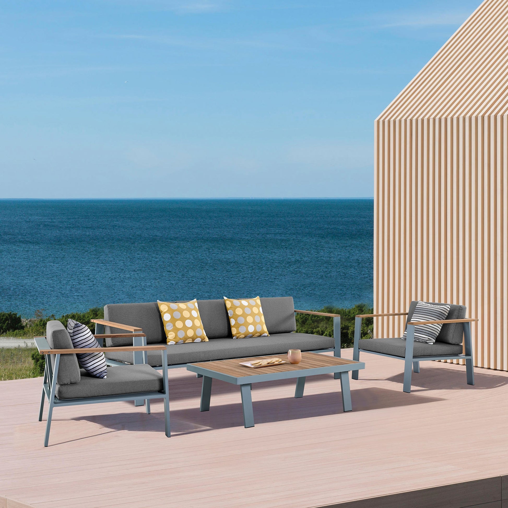 The Armen Living Nofi contemporary 4 piece patio set is an elegant ensemble of items that is certain to enhance the beauty of any modern outdoor seating arrangement. Featuring 2 arm chairs, 1 three-seater sofa, and 1 coffee table, the Nofi is an ideal arrangement for comfort and aesthetic balance. The beautiful Nofi coffee table features an aluminum frame complemented brilliantly by a sturdy teak wood top. The same teak wood is used to accent the arms of the sofa and arm chairs to enhance aesthetic cohesion. The olefin upholstered arm chair and sofa cushions feature foam padding and are water, chemical, and fade resistant. The Nofi set also comes with 4 throw pillows for added comfort and support. The lightweight Nofi outdoor patio set is available with your choice of charcoal finish with taupe cushions, or gray finish with gray cushions.