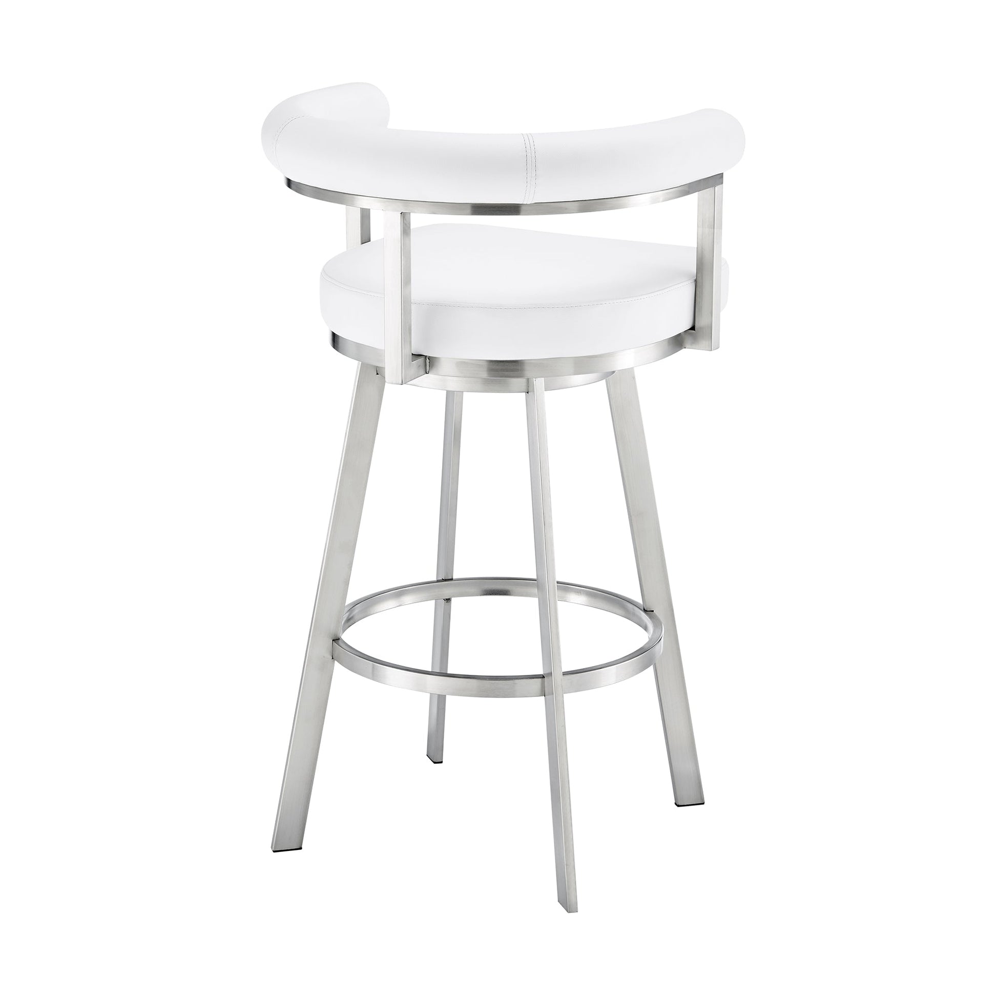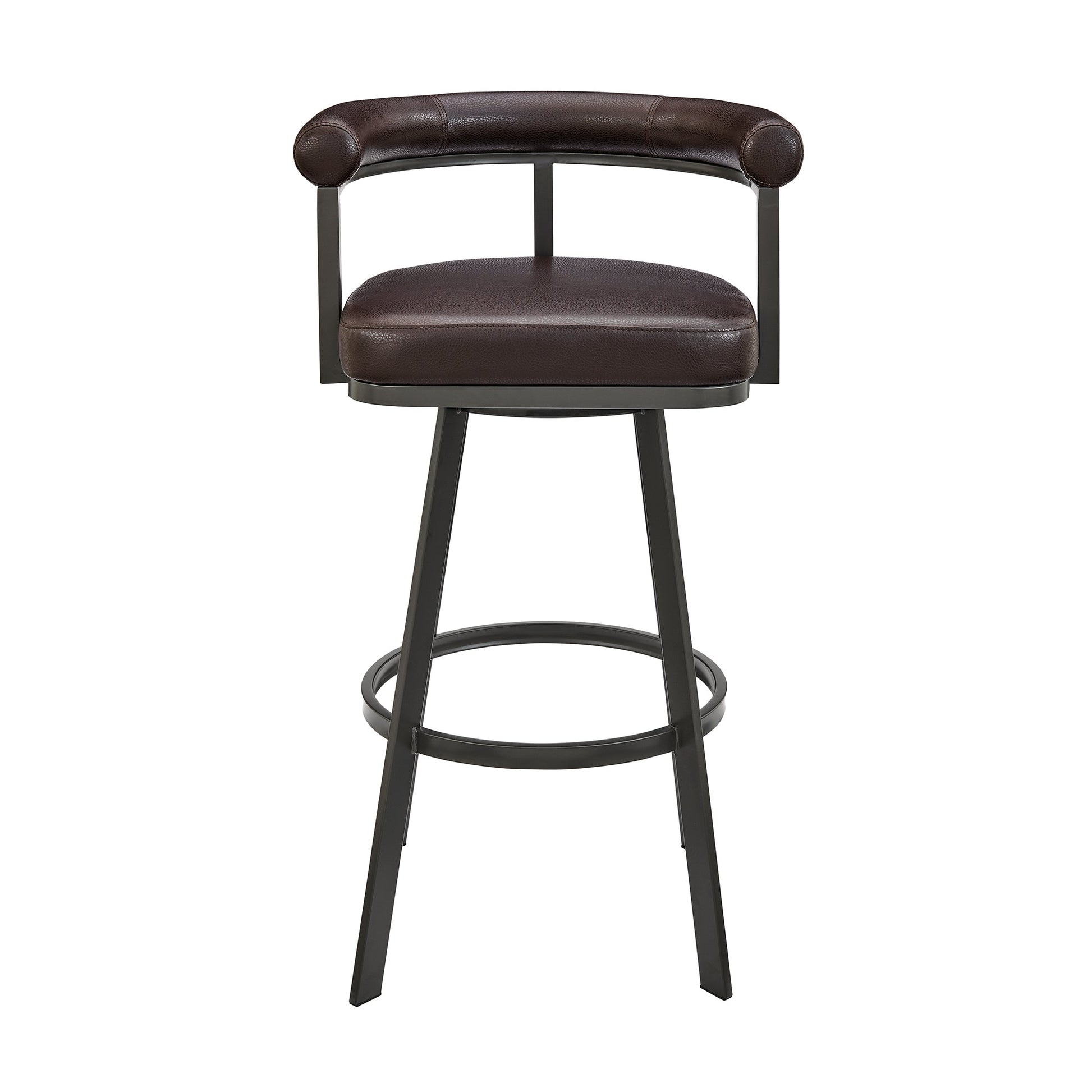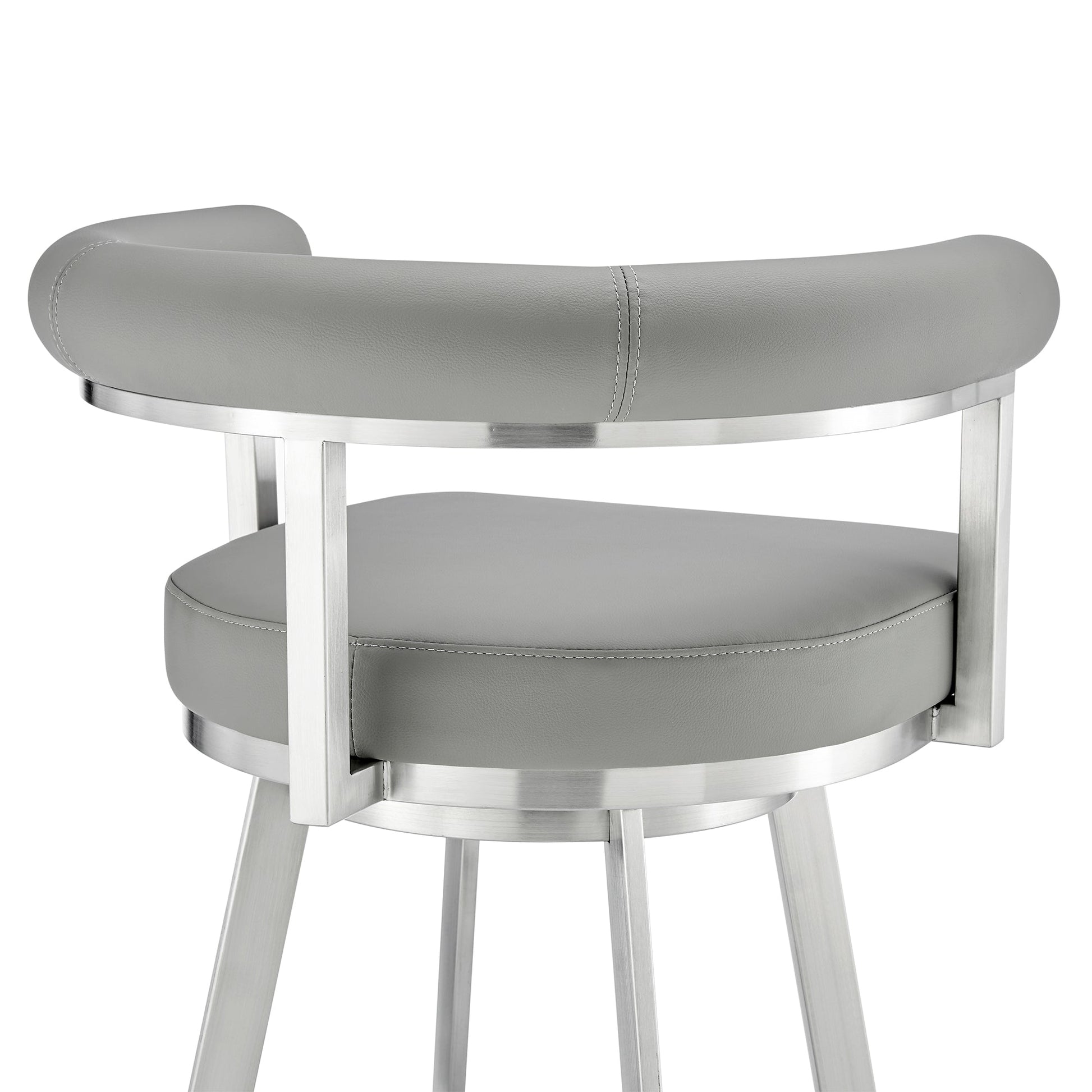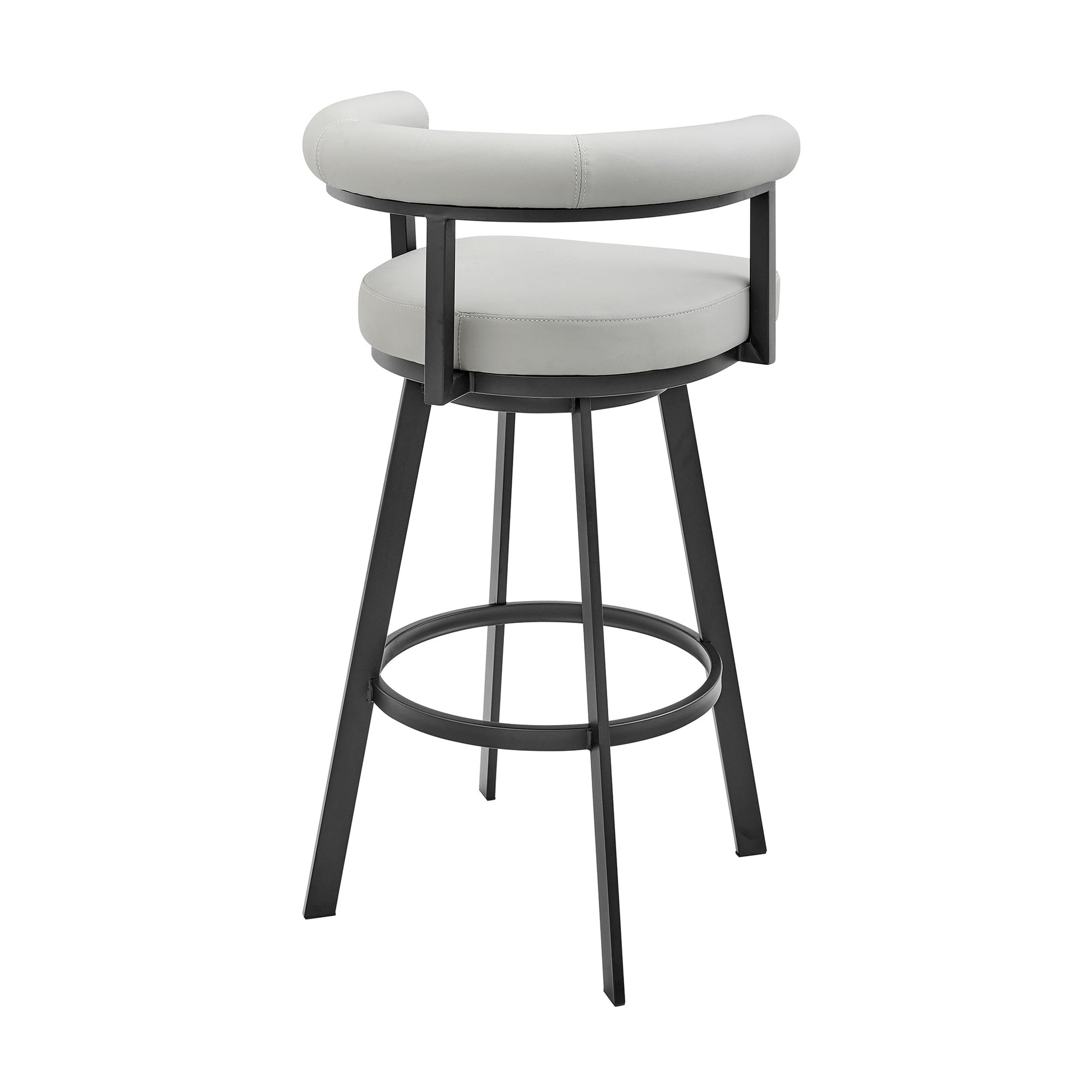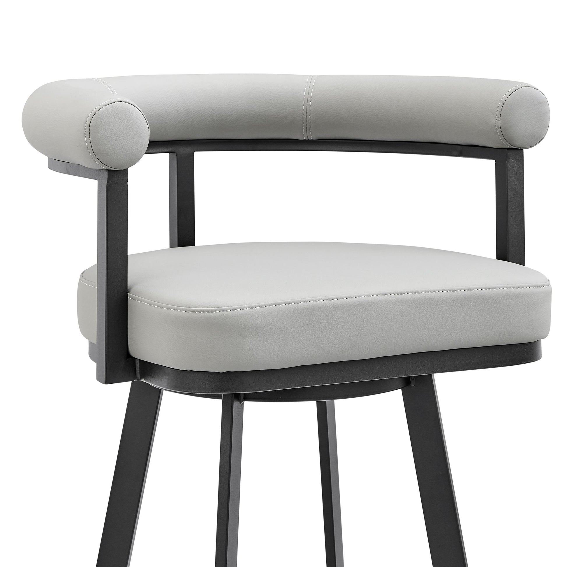 Glam up your space with the flair of our stylish swivel bar and counter stools, expertly crafted from faux leather and metal by Armen Living. Featuring a minimal and streamlined barrel back, these mid-century modern stools are designed to enhance any setting with a sleek and inviting look. The plush cushioning at the back, paired with a padded seat, ensures a comfortable experience, while the open back design promotes breathability.