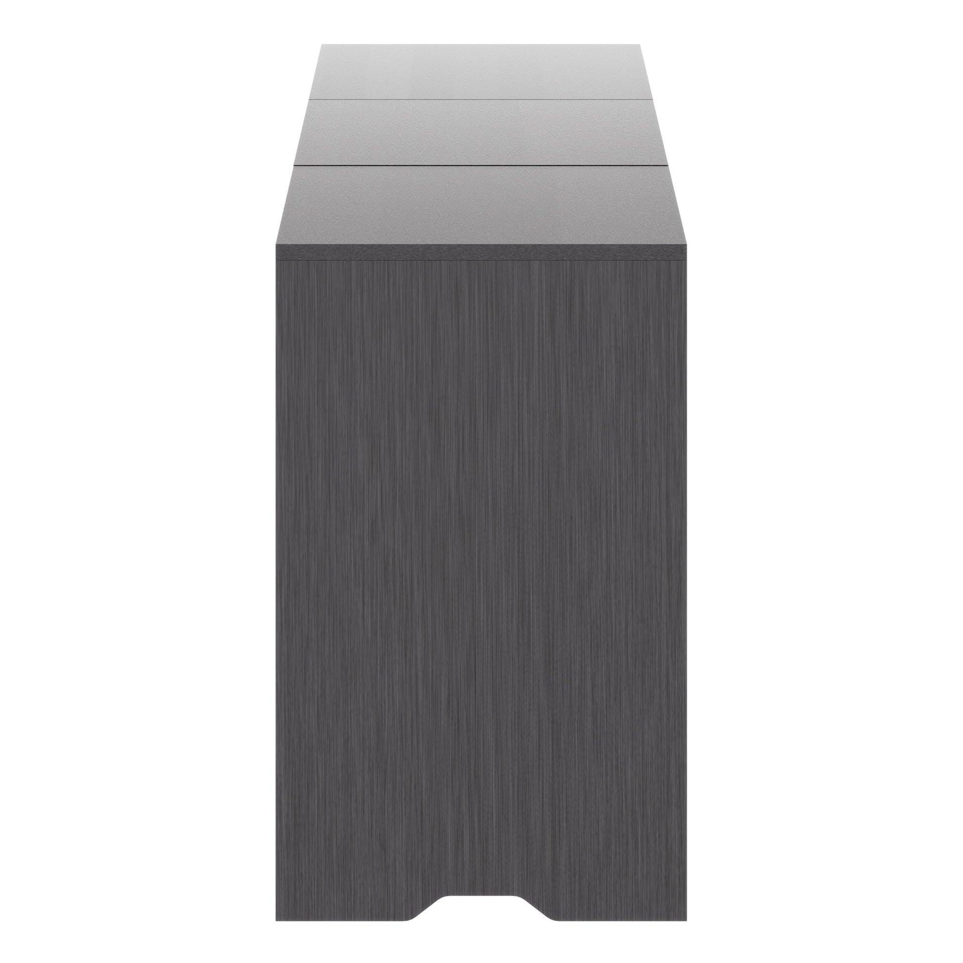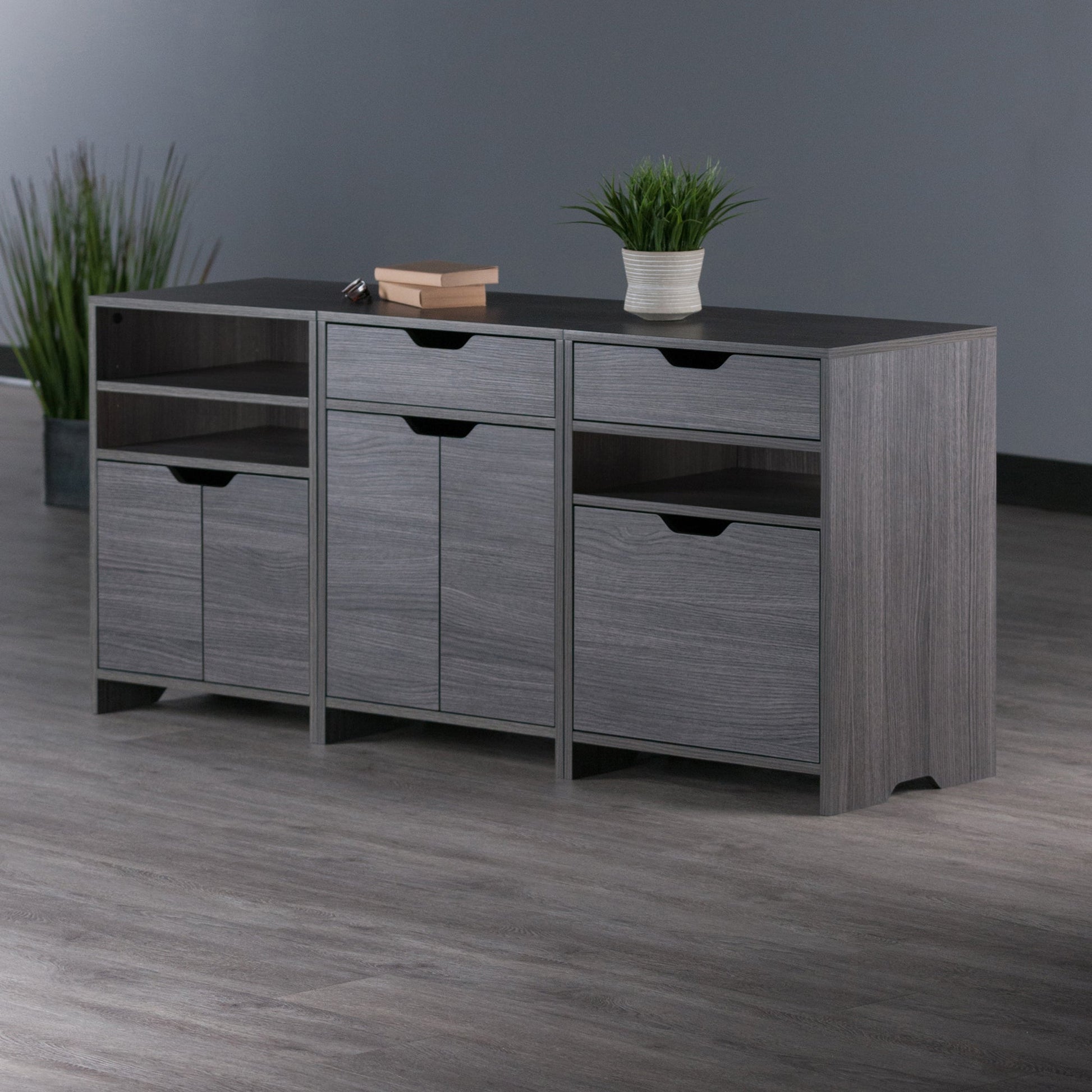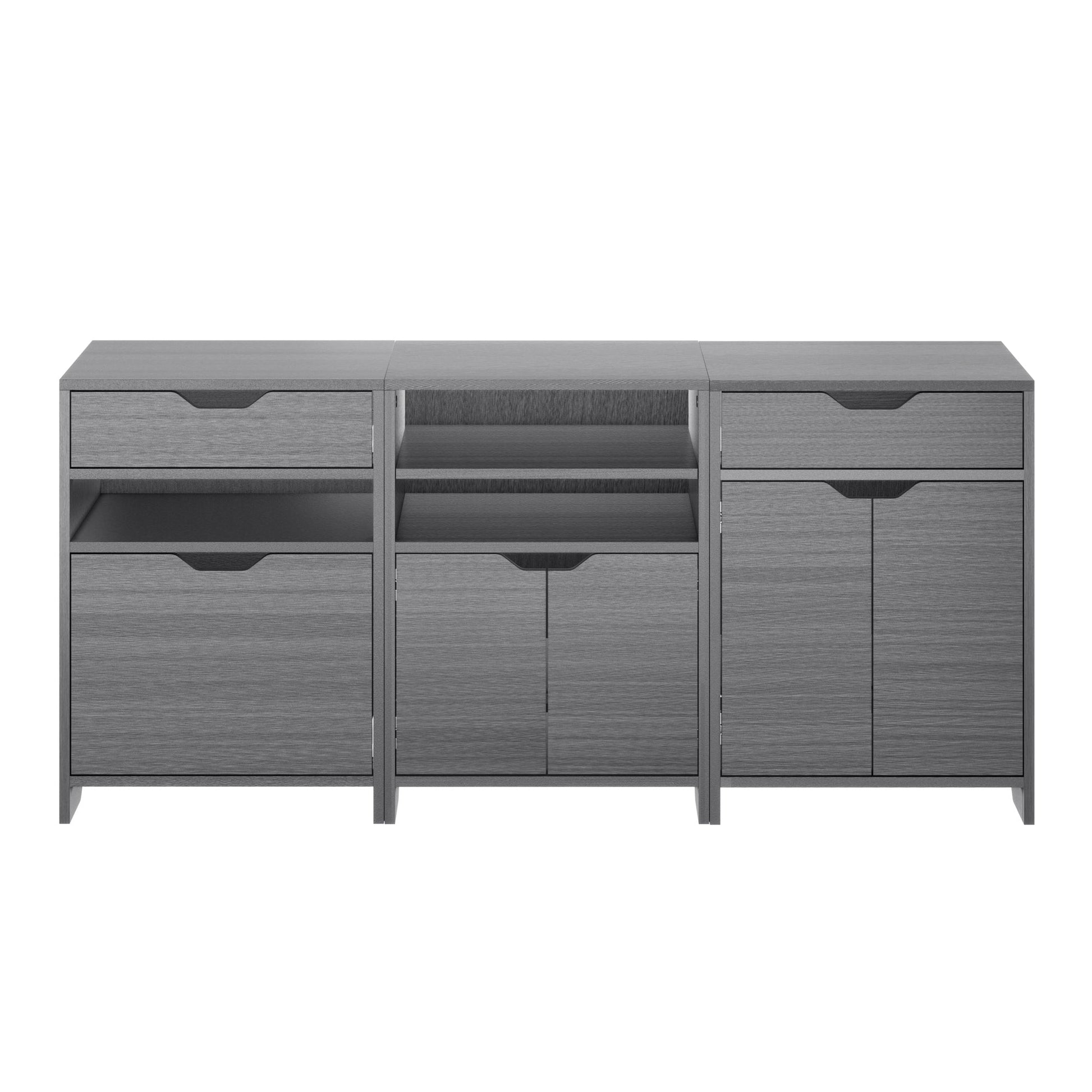 The Winsome Wood 3-Pc Nova Storage Cabinet set offers a streamlined way to transform any room. Each piece is distinct, freestanding and designed to provide easy-access storage. All together, they provide 2 cabinets, 3 open shelves, and 3 drawers, one of which is a full-size file cabinet. Place them side-by-side to create a handy countertop, or use them individually as needed. A perfect home office set with plenty of storage for organizing and reducing the clutter of electronics and office supplies. Two of the cabinets have shelves that can be either adjusted in height or removed to adapt to a variety or storage needs. All while the file rods in the filing cabinet are adaptable to either legal or letter size paperwork. The set is made of sturdy, composite wood, with each top surface having a static weight capacity of 50 lbs. With cut-out handles and wood-grained charcoal finish that provide a contemporary, polished look. The set conveniently ships each cabinet in an individual box, each with all the hardware needed for assembly.