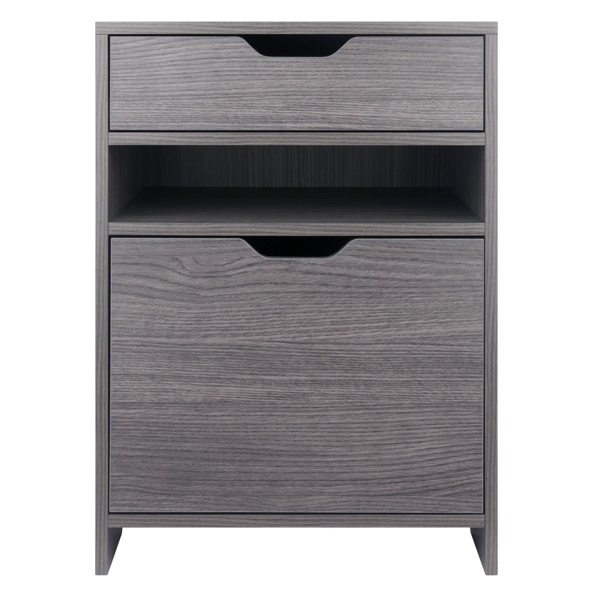 The Winsome Wood Nova Filing Cabinet with Drawer offers a streamlined way to transform any room where you need stylish, easy-access storage. This freestanding cabinet is ideal in a home office for keeping important paperwork and documents close at hand while doubling as a printer stand. Use it as a side table in a child's bedroom to reduce the clutter. The file rods are adjustable to accomodate either legal or letter size files. Or remove the file rods to create more storage to organize toys, electronics, and sports gear. The cut-out handles and a wood-grain charcoal finish provide a contemporary, simple look. Made of sturdy composite wood, this cabinet conveniently ships in 1 box with all the hardware needed for assembly. Replacement part request can be submitted directly to the manufacturer, with sales receipt, within 60 days from date of purchase.