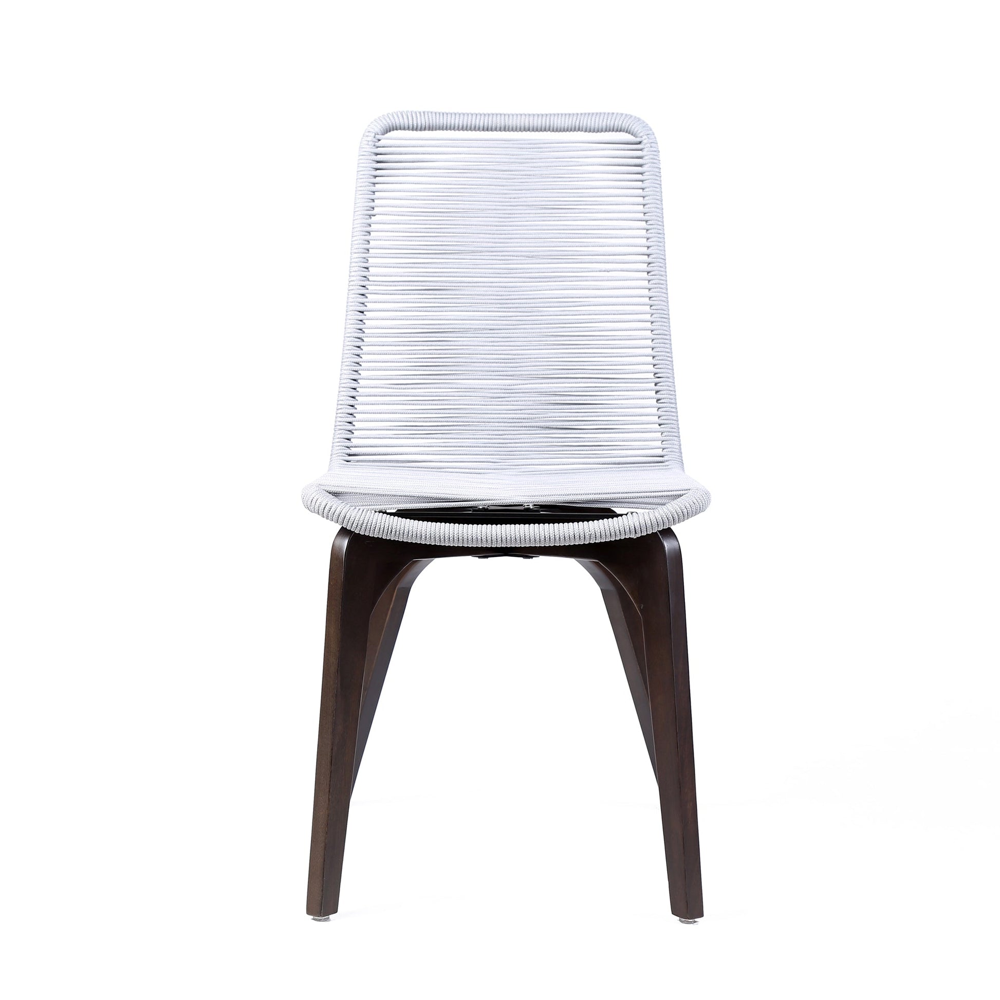 The Armen Living Oasis and Island 5 Piece Dark Eucalyptus and Stone Outdoor Patio Dining Set is ideal for any outdoor space. Each individual table surface slat expands geometrically outward, while a super stone concrete center tastefully juxtaposes the rest of the table. Built from solid eucalyptus, the Oasis naturally repels moisture to keep the elements from affecting its resilient design. Below, crossed legs maximize leg space while maintaining a solid foundation for the table above. The Oasis table comes with 4 Island chairs, wrapped in resilient regatta rope cording, the seat and back provide a remarkable level of comfort while still allowing the elements to pass through. The beauty of this pairing lies in the subtle interplay of soft and neutral colors with a contemporary design structure. The Oasis and Island dining set is available in your choice of dark or light Eucalyptus.
